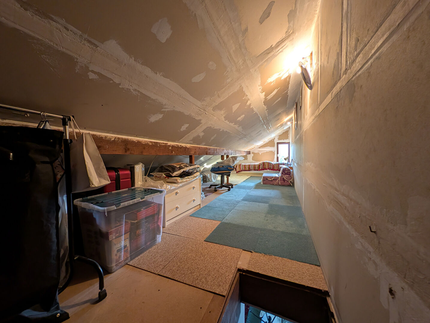 Entrée, WC, cuisine, séjour, chambre. Combles de 22m² au sol isolés.