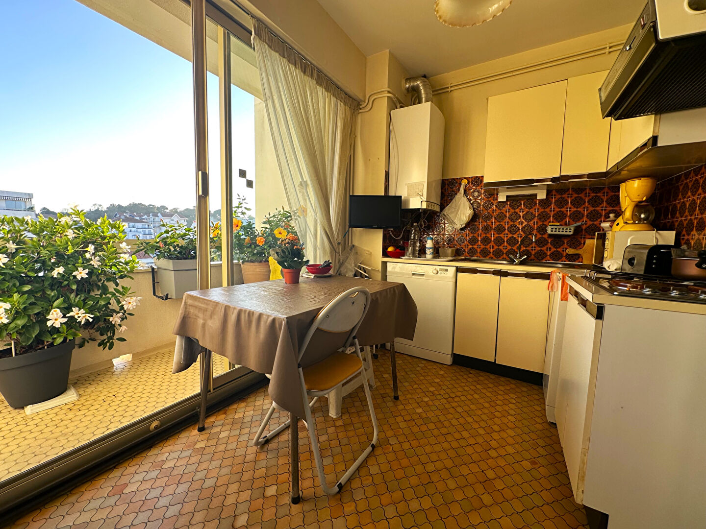 Entrée avec placard, cuisine indépendante avec accès balcon plein Sud, Salon/séjour lumineux traversant donnant sur grande terrasse avec vue panoramique sur le Bassin.