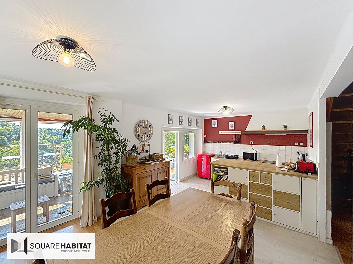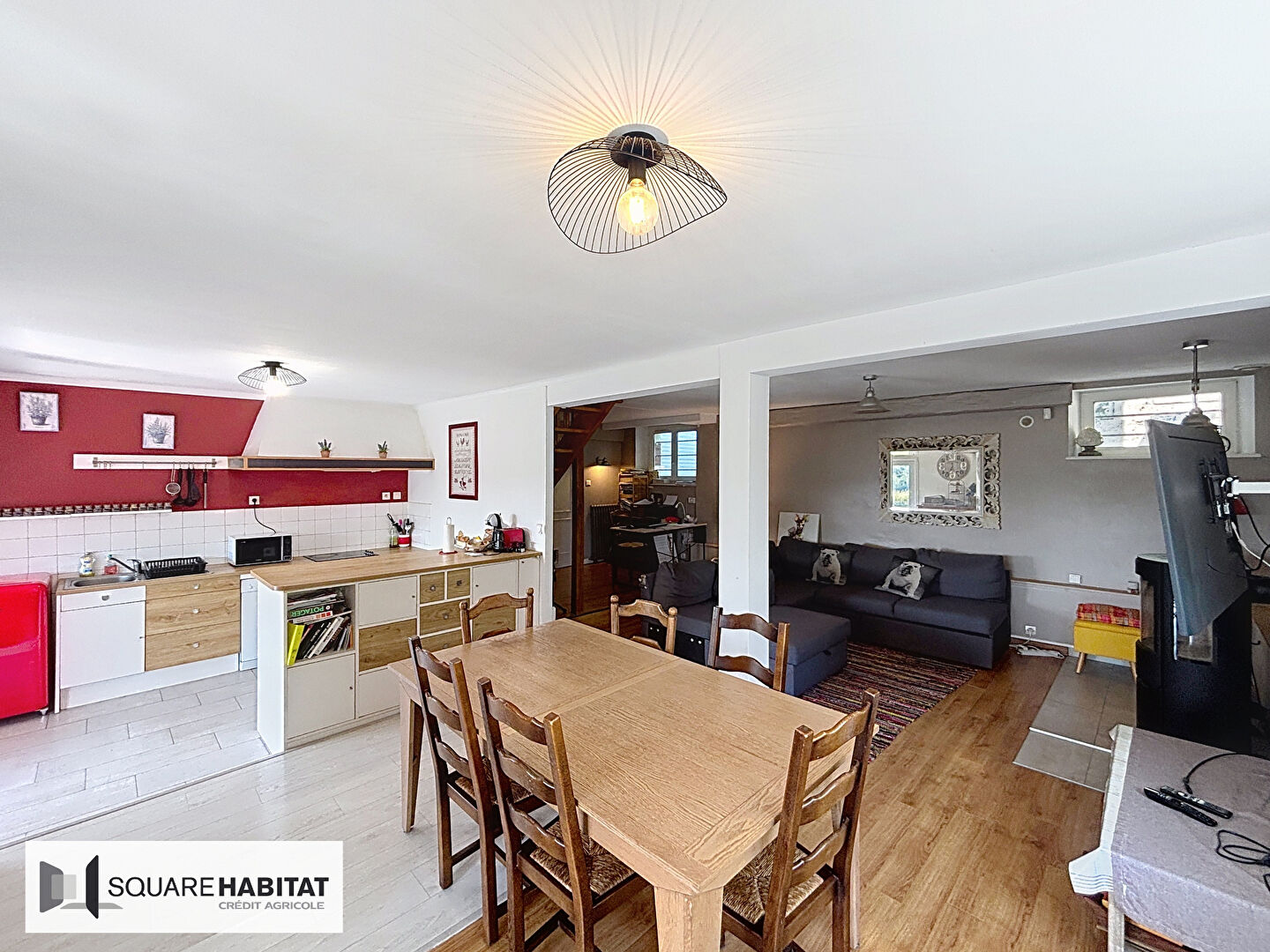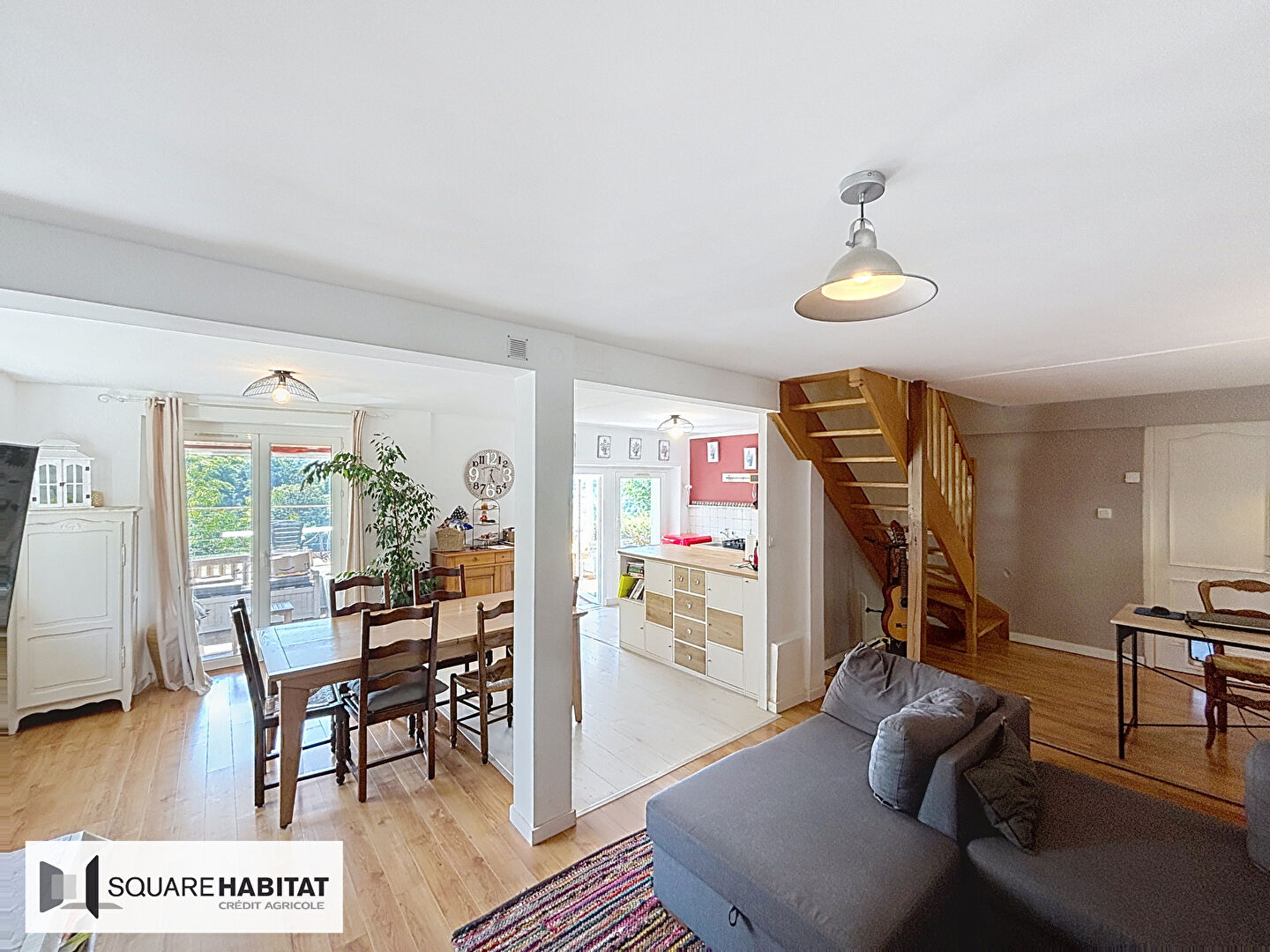 Elle se compose au rez-de-chaussée d'une véranda lumineuse ouvrant sur une terrasse panoramique, d'une cuisine, d'un salon-séjour chaleureux avec poêle à bois, d'une buanderie et d'un garage.