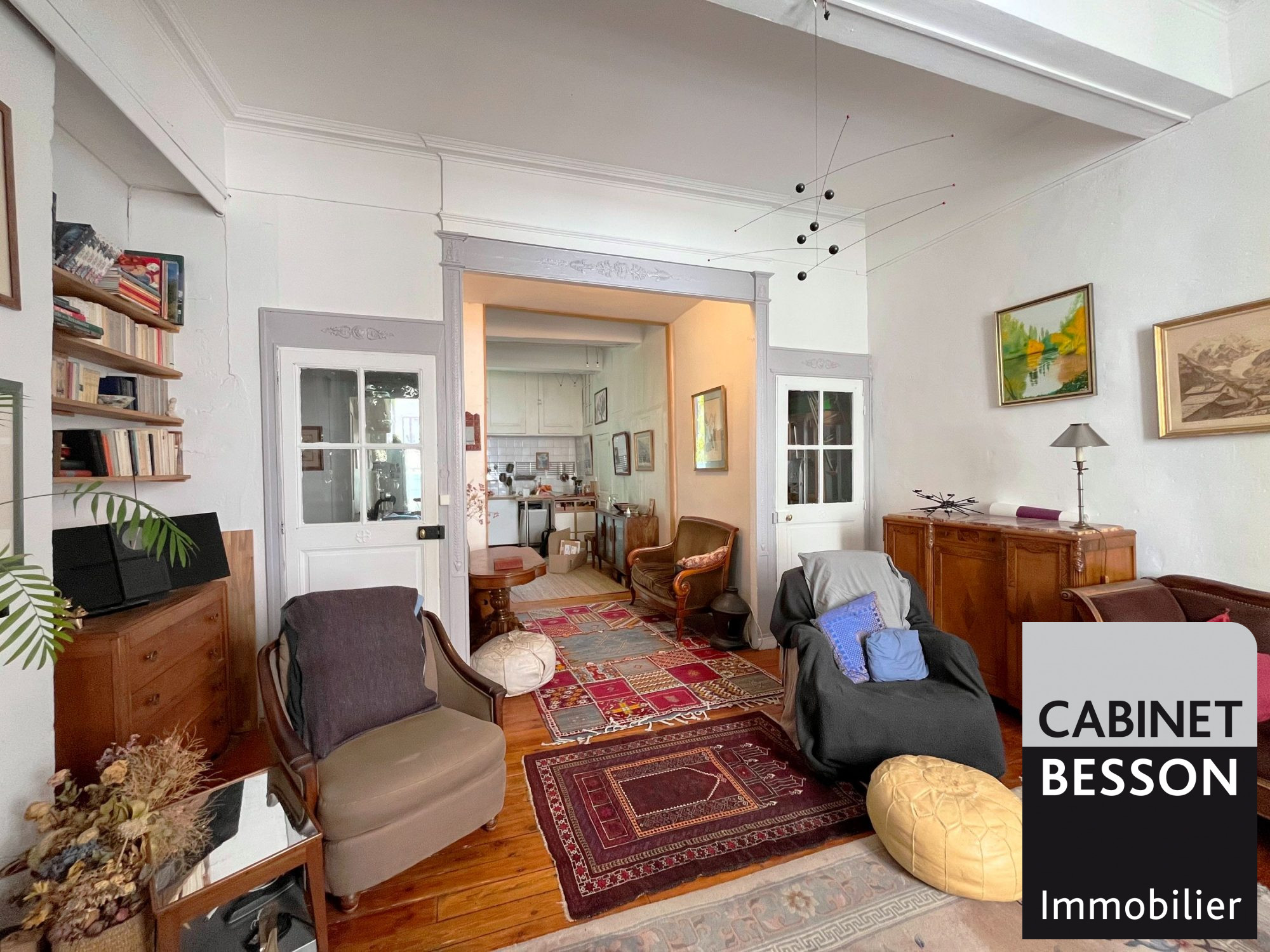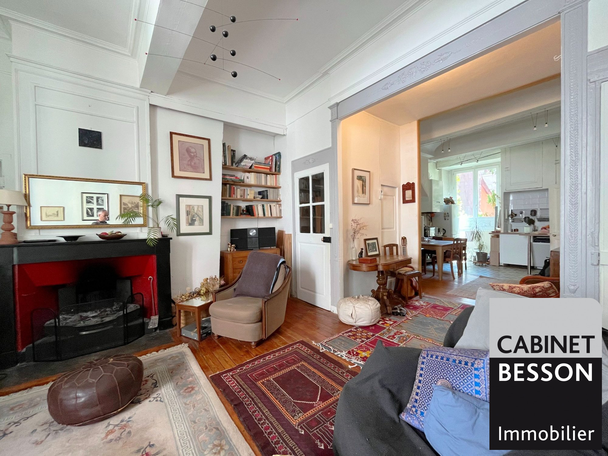 Charme de l'ancien conservé (boiseries, parquets, carreaux ciment, cheminées).
