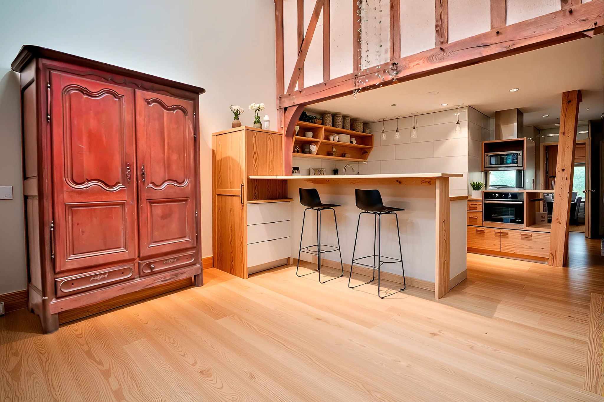 En remontant l'escalier se trouve au deuxième étage une chambre spacieuse avec un parquet en chêne et des poutres apparentes.