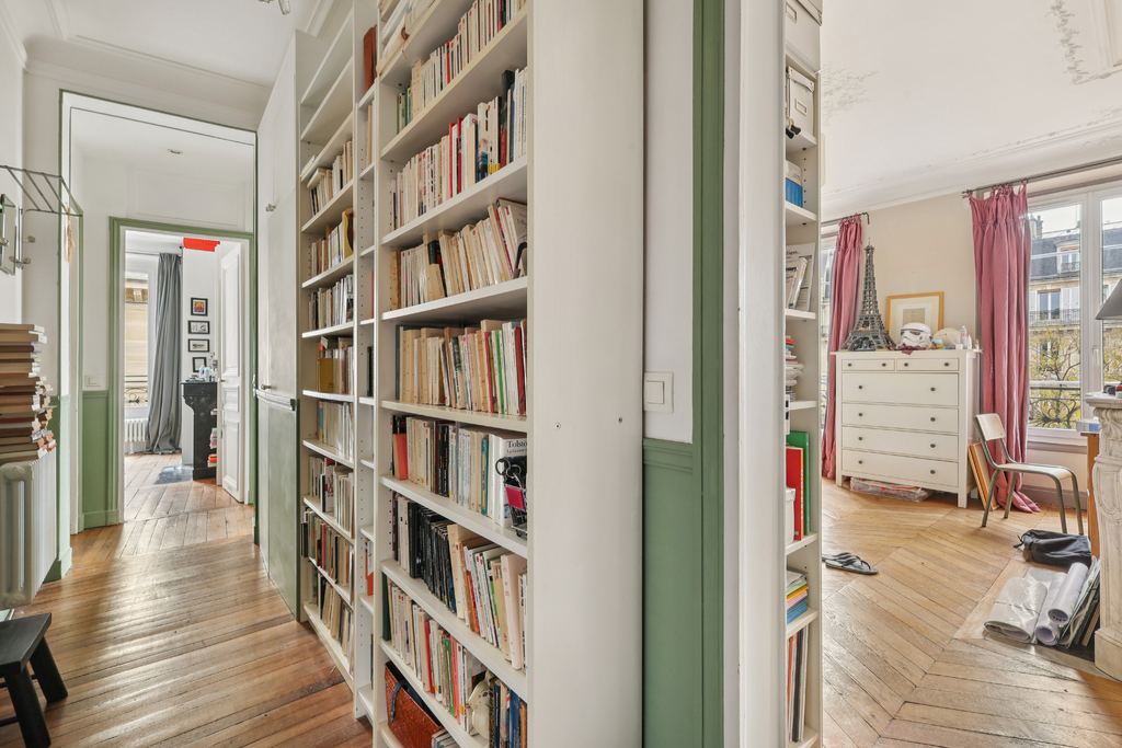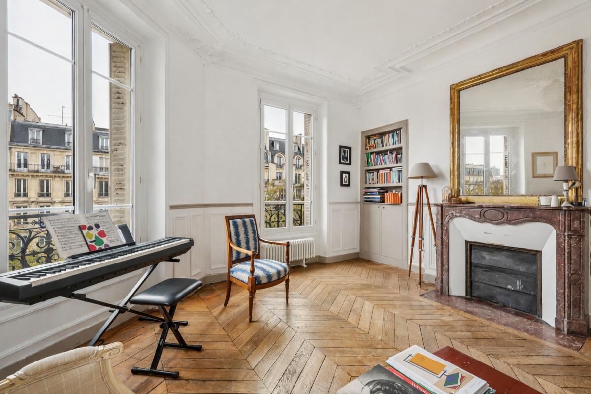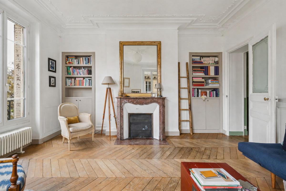 Baigné de lumière grâce à son exposition sud / ouest, l'appartement bénéficie d'un très beau séjour d'angle, offrant de larges ouvertures, une belle hauteur sous plafond de 2,90 m, des parquets en point de Hongrie, des moulures et cheminées décoratives.