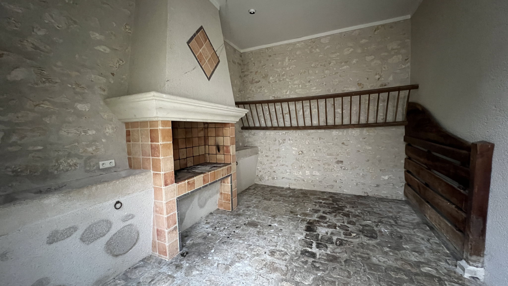 Au premier étage : un palier avec placard menant à une cuisine aménagée et équipée, un vaste salon/salle à manger traversant avec cheminée ouverte, ainsi qu'une pièce supplémentaire également dotée d'une cheminée.