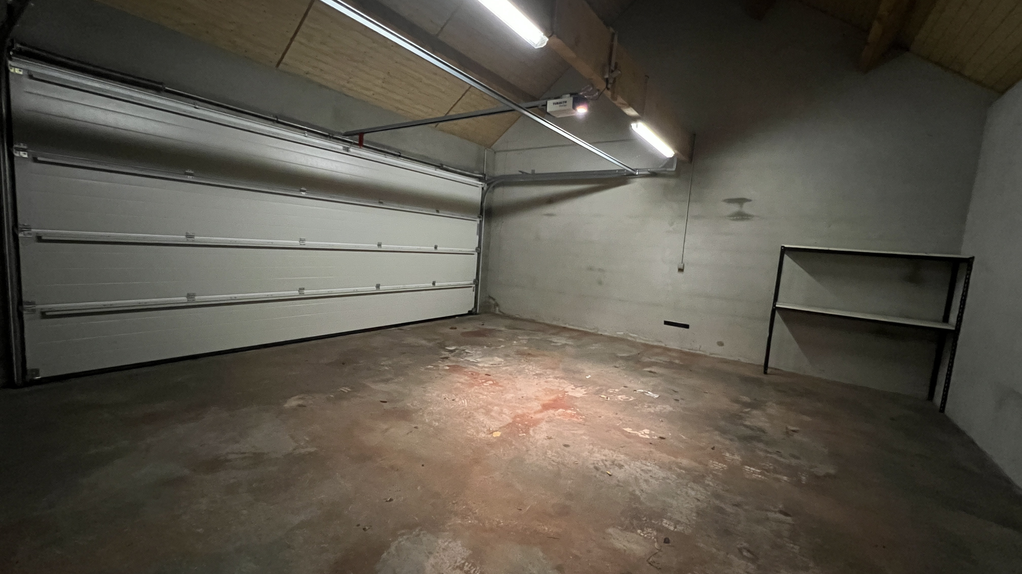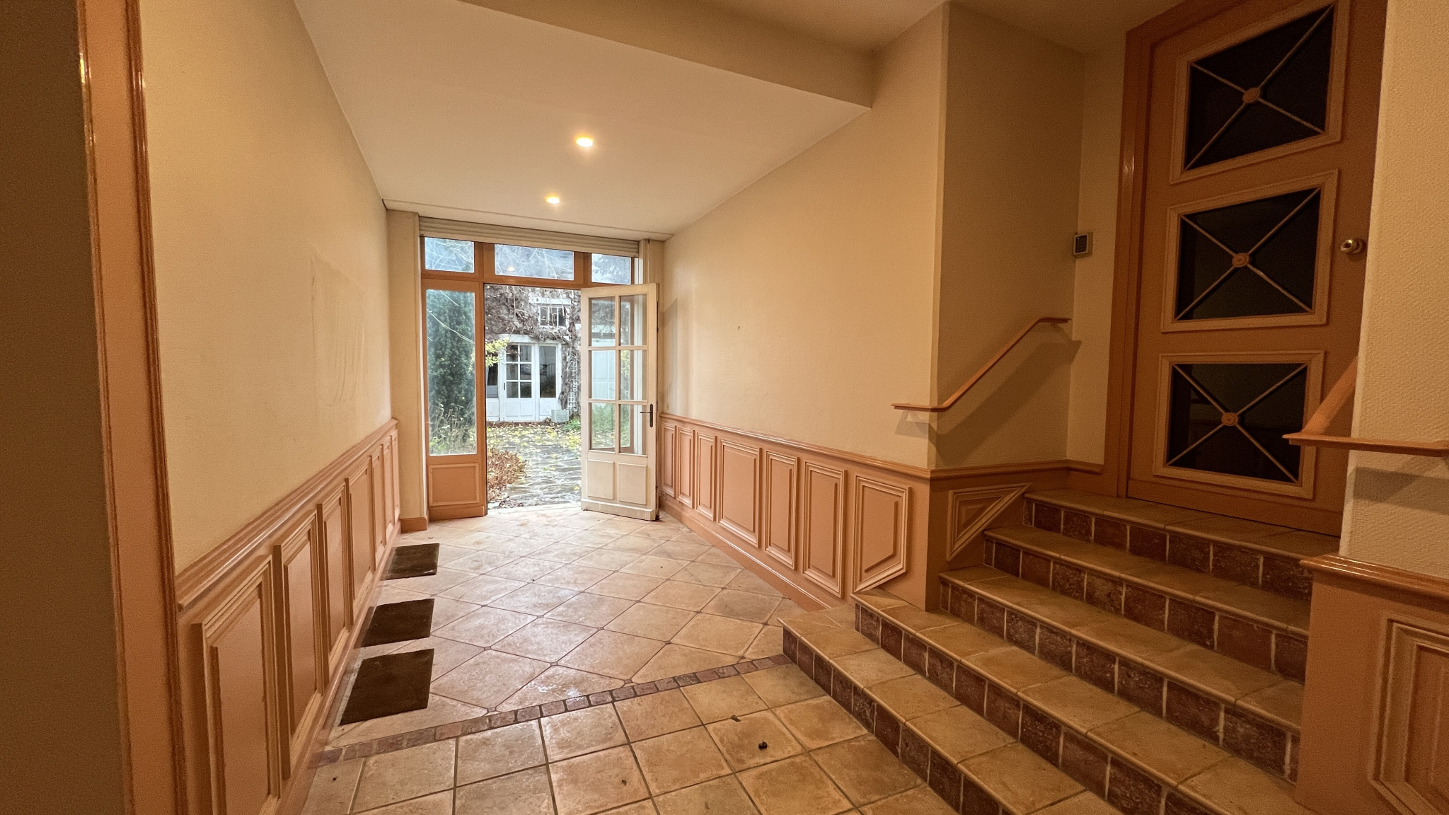 L'accès se fait par un porche desservant, d'un côté, un double garage et, de l'autre, l'entrée de la maison. Ce porche s'ouvre également sur le jardin, agrémenté d'une dépendance de type ancienne écurie.