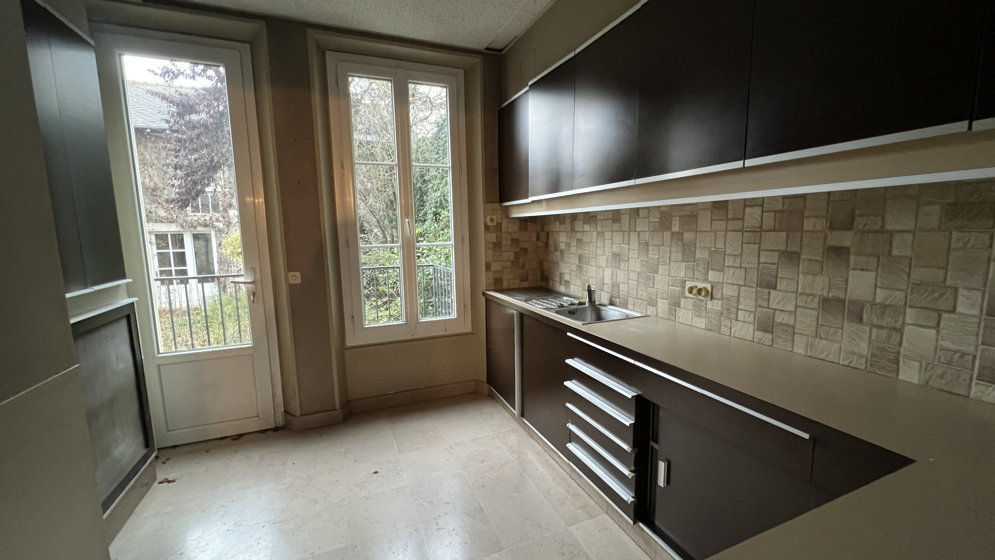 Au rez-de-chaussée : une entrée desservant trois pièces d'environ 12 m2, 12,7 m2 et 13,47 m2, ainsi qu'une cuisine meublée non équipée offrant un accès direct au jardin.