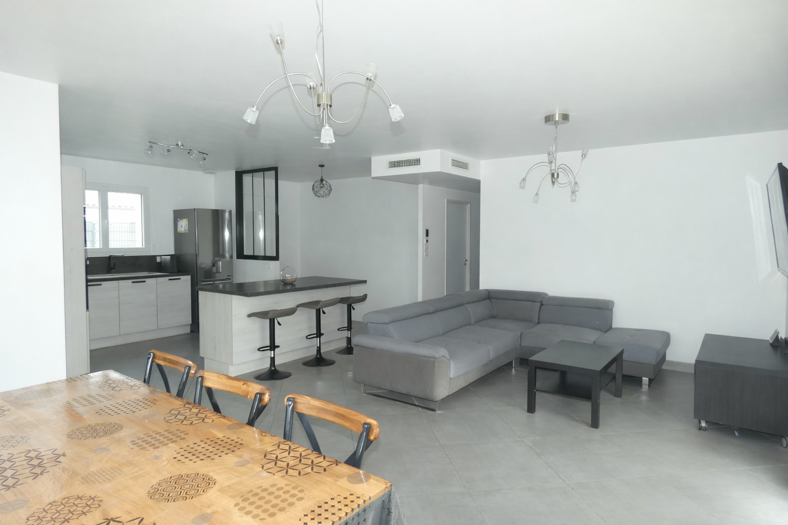 Dès l'entrée, vous découvrirez un espace accueillant et fonctionnel. Elle s'ouvre ensuite sur une cuisine équipée ouverte, donnant directement sur un salon/séjour lumineux, formant un bel espace de vie convivial.