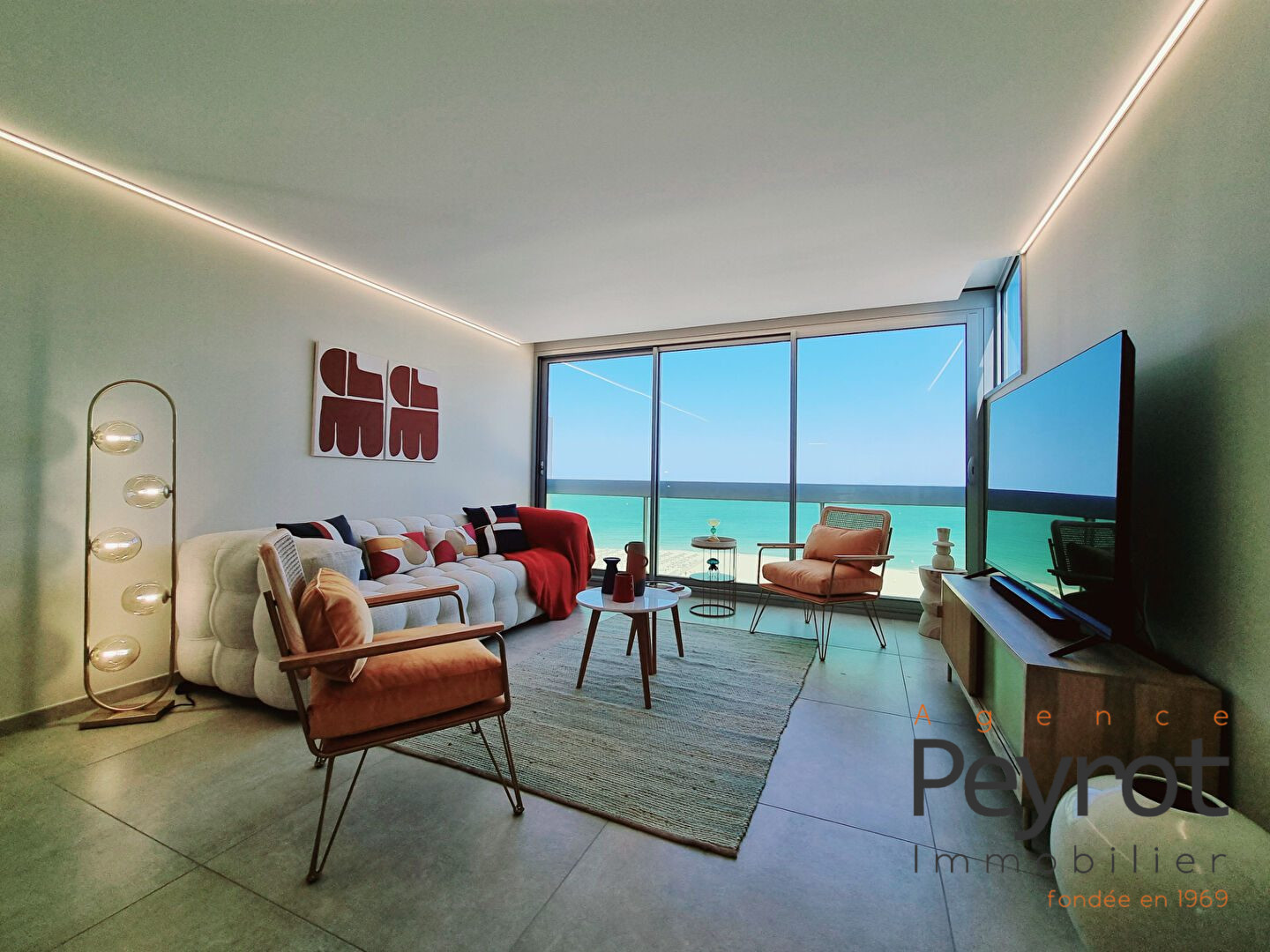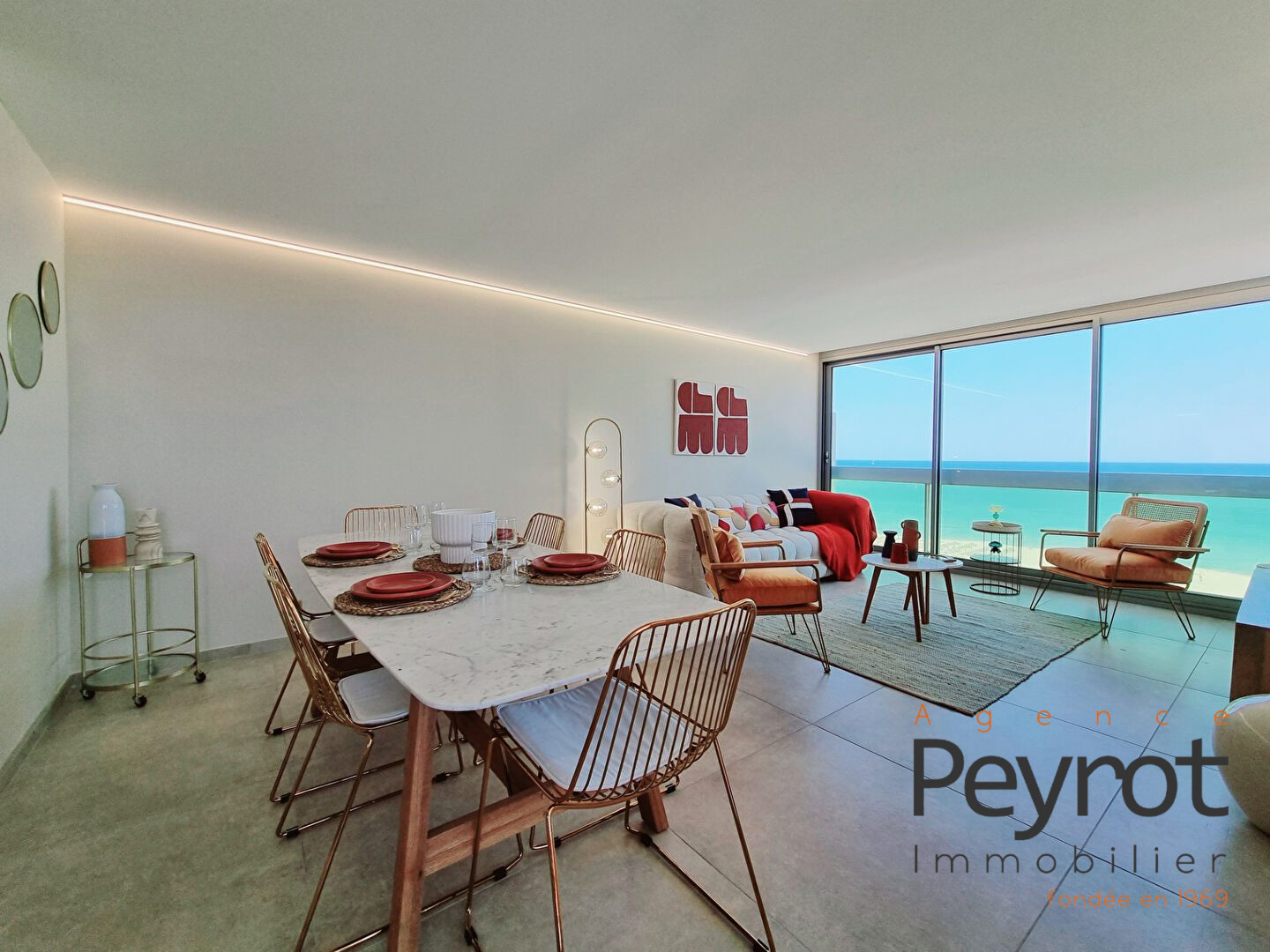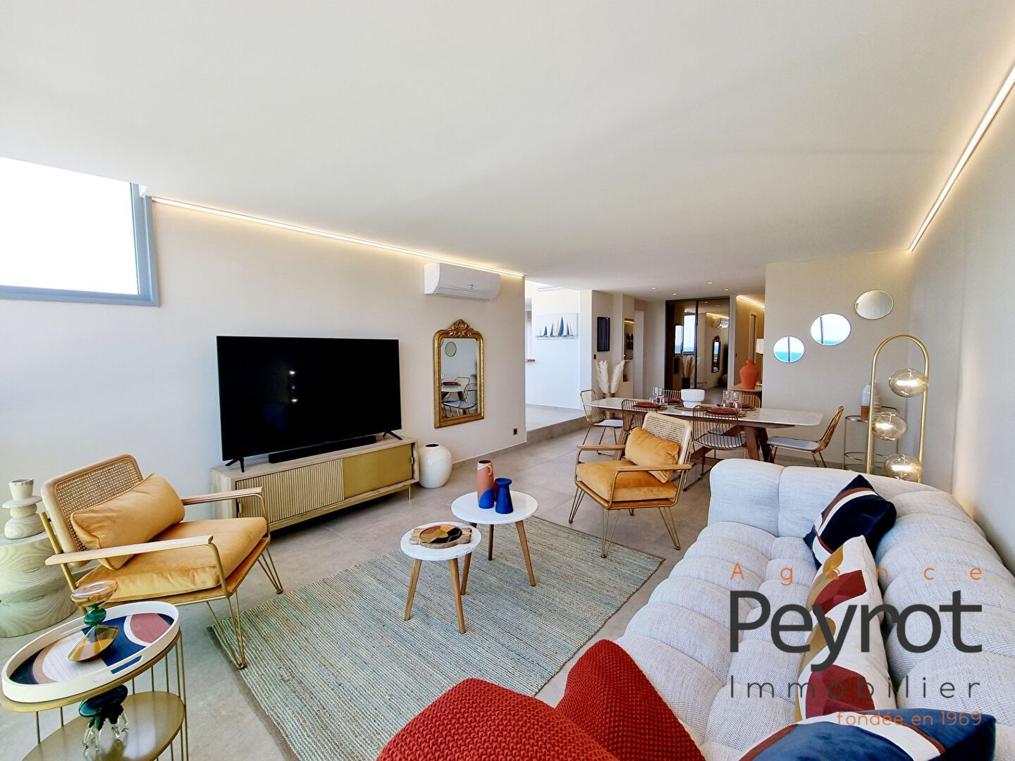 Découvrez cet Appartement avec son solarium entièrement rénové au 7ieme et dernier étage d'une résidence calme et sécurisée. L'appartement séduit par sa décoration, ses prestations haut de gamme, son rooftop pour une superficie habitable de 92 m2 . Hall d entrée lumineux donnant sur la cuisine ouverte et pièce de réception avec vue plongeante sur la mer. 3 chambres avec vue mer, étang et montagne. Une salle d'eau ainsi qu'un wc séparé. Un parking sécurisé en sous sol, une cave, gardien, clim réversible. Commerces à proximité, clubs de plage. L'art de vivre méditerranéen vous attend. Vendu meublé