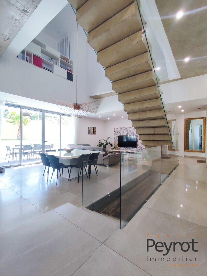 En exclusivité, découvrez cette superbe villa d'architecte neuve aux prestations haut de gamme. Idéalement située, à proximité immédiate du centre-ville, des commerces et des écoles, cette somptueuse villa contemporaine de 6/7 pièces, construite en 4 faces sur une parcelle de 502 m², séduit par son design moderne, ses volumes généreux et ses finitions raffinées. D'une superficie d'environ 221 m², elle allie avec harmonie confort, élégance et fonctionnalité. Dès l'entrée, un vaste hall vous accueille et s'ouvre sur un séjour cathédrale baigné de lumière, créant une atmosphère chaleureuse et conviviale. La cuisine ouverte, entièrement aménagée et équipée, complétée par un cellier attenant. Le rez-de-chaussée abrite également une suite parentale élégante, comprenant une chambre, une salle d'eau et un dressing, ainsi qu'un WC indépendant et de nombreux rangements encastrés. À l'étage, deux suites spacieuses, chacune dotée de leur propre salle d'eau et dressing, assurent confort et intimité. Un dégagement faisant office de bureau surplombe le salon, ajoutant une touche d'originalité et de caractère à l'ensemble. Un balcon prolonge cet espace, offrant une agréable vue sur l'extérieur. Le sous-sol constitue un véritable atout supplémentaire. Il comprend une suite avec chambre, salle d'eau et patio privatif, ainsi qu'une vaste pièce de 50 m² aménagée en salle de jeux. Un double garage de 40 m² vient parfaire ce niveau, garantissant à la fois praticité et confort. Les extérieurs, soigneusement paysagés, sont pensés pour la détente et la convivialité. Une piscine élégante, une terrasse-solarium, un espace barbecue et un jardin viennent sublimer ce cadre de vie paisible. Cette propriété unique séduit par son architecture contemporaine, ses prestations d'exception et son emplacement privilégié. Un bien rare, idéal pour celles et ceux en quête de confort, de modernité et de raffinement. Agence Peyrot 04.48.22.13.23 www.peyrot-immo.fr