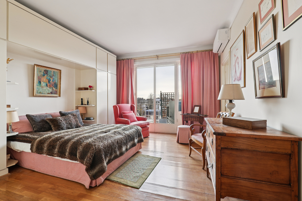 Côté nuit, la suite parentale dispose également de son balcon avec une vue dégagée sur Paris, d'un bureau attenant et d'une salle de bains avec toilettes. Une seconde chambre avec sa salle de bains privative et toilettes, ainsi qu'un deuxième salon pouvant aisément devenir une troisième chambre, viennent compléter l'ensemble.