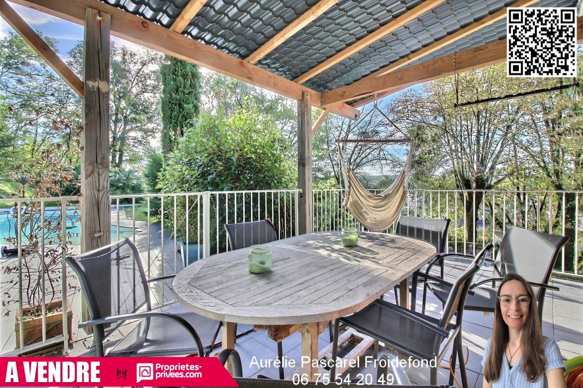 -Une 2ème entrée donnant sur une grande pièce à vivre d'environ 56m², avec salle à manger, salon avec poêle à granulés, et CUISINE ouverte et équipée, et accès DIRECT à la TERRASSE couverte, au JARDIN et à la PISCINE de 8mx4 m.
