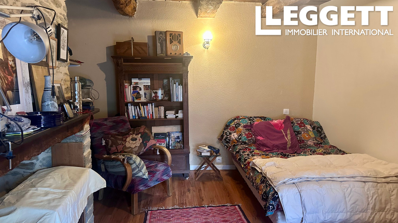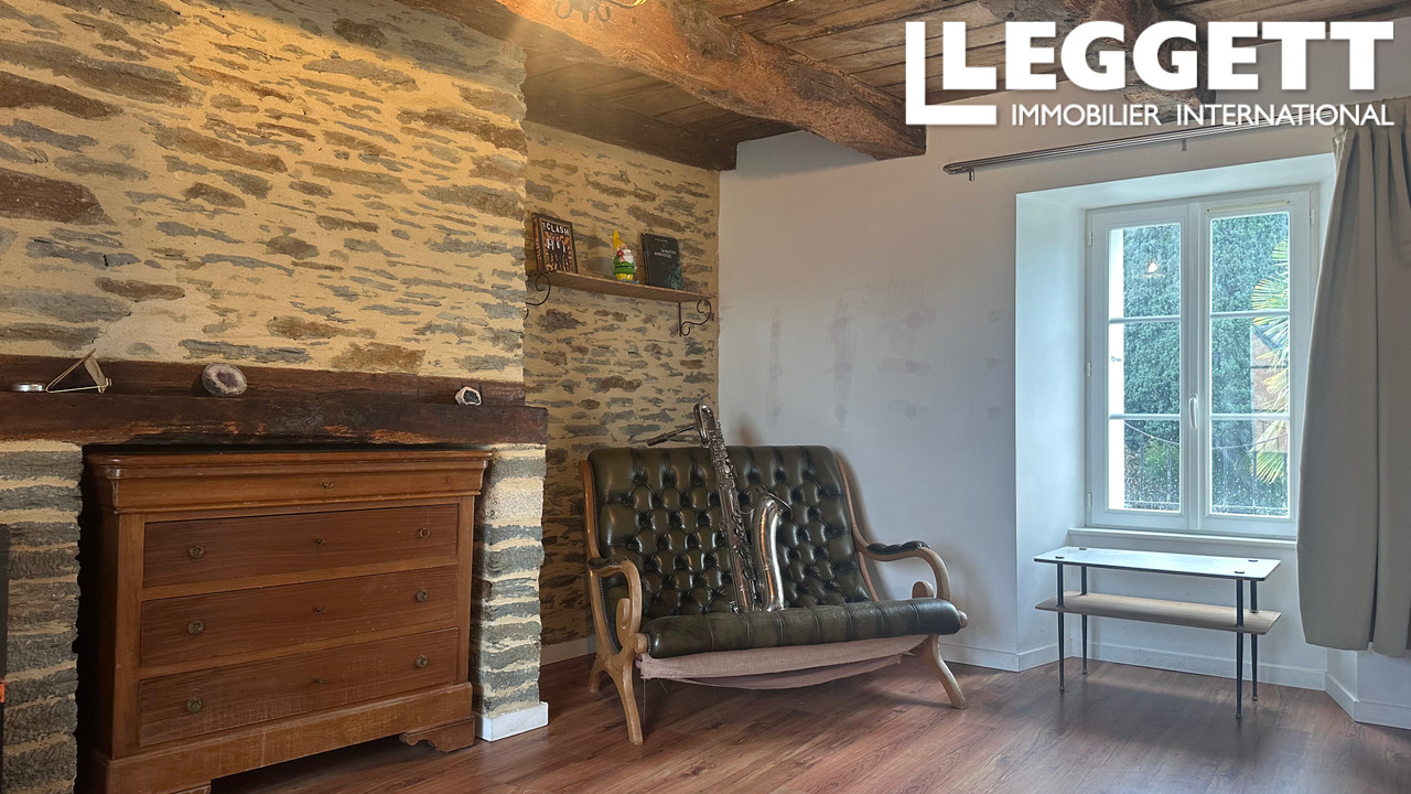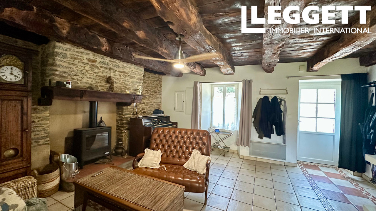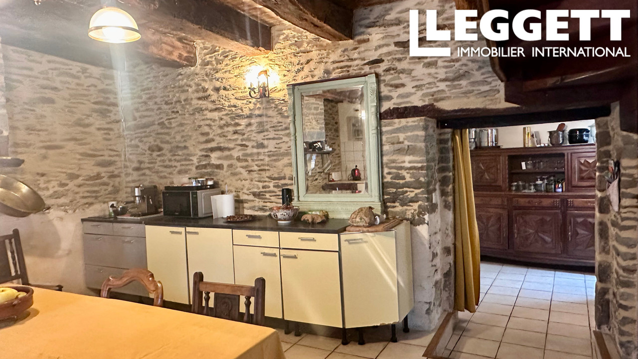 Elle offre un vaste espace de vie chaleureux avec cheminée et poêle à bois, une cuisine de caractère avec poutres et pierres apparentes, une arrière cuisine, une salle de bain avec baignoire.