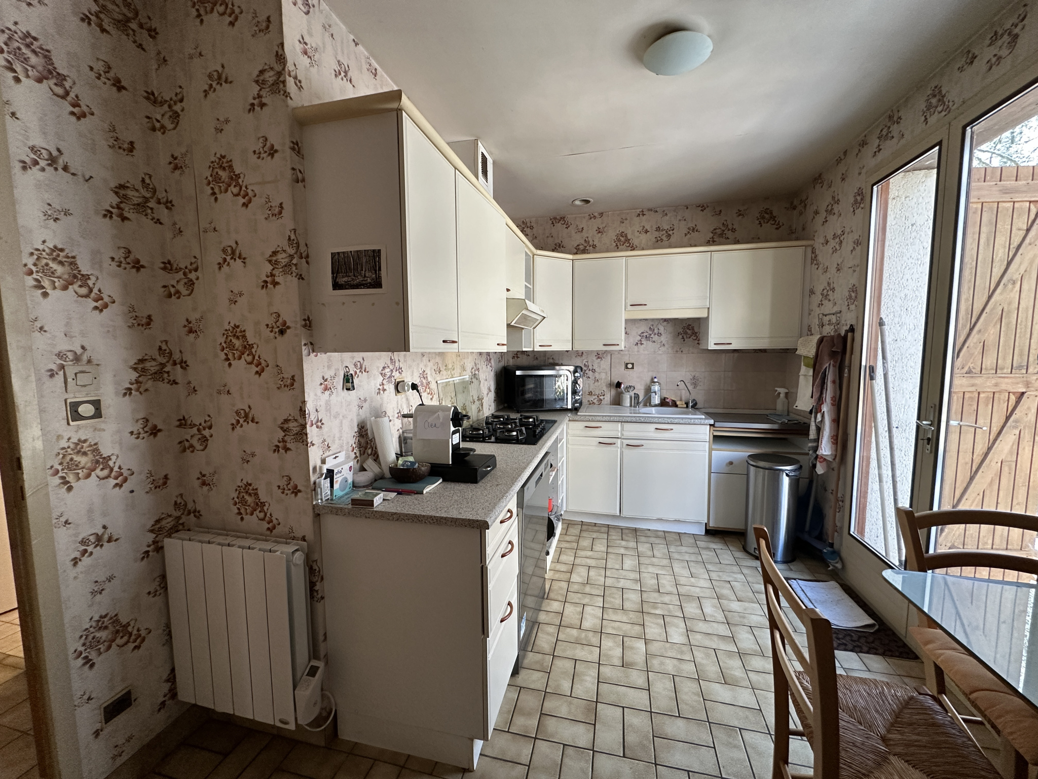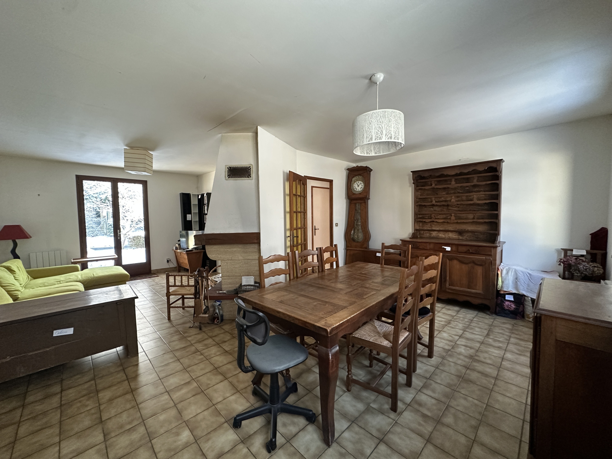 Séjour de 40,6 m2 avec insert, et cuisine séparée de 9,8 m2 (possibilité d'ouverture sur le séjour), donnant accès à une terrasse surélevée de 19 m2 surplombant le terrain, avec vue sur la forêt environnante.