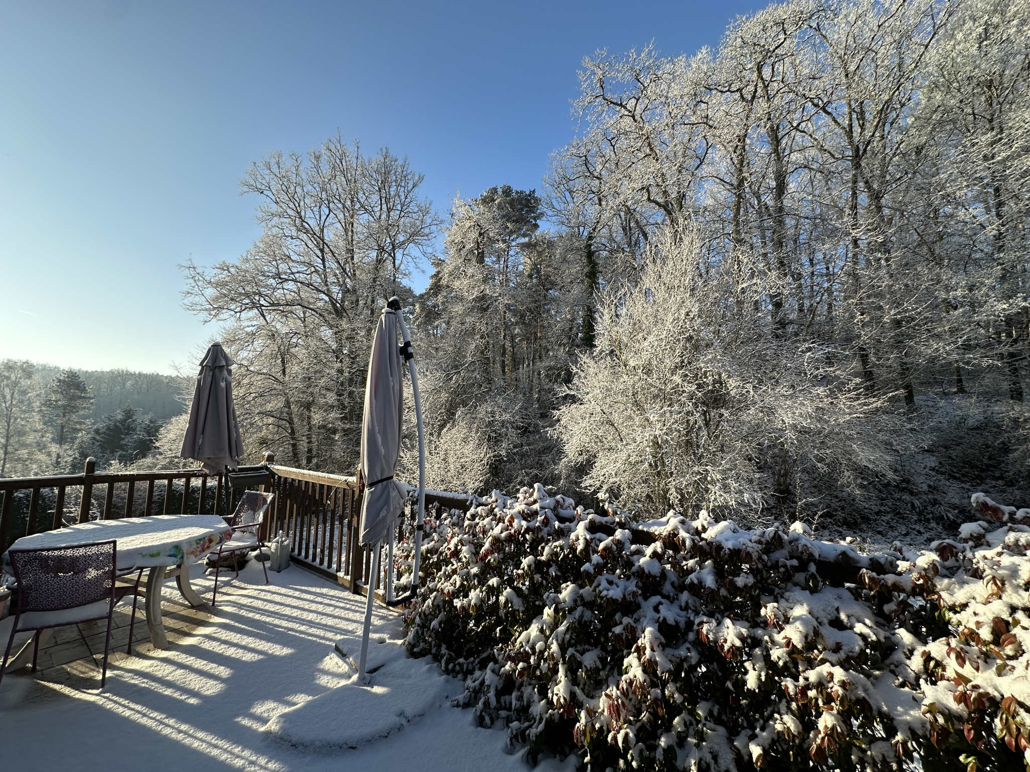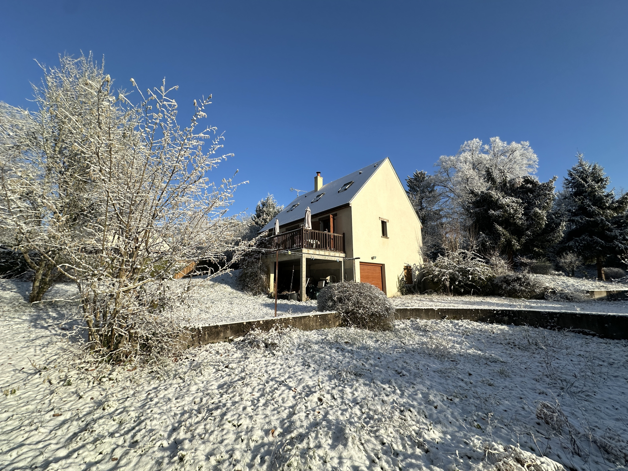 Séjour de 40,6 m2 avec insert, et cuisine séparée de 9,8 m2 (possibilité d'ouverture sur le séjour), donnant accès à une terrasse surélevée de 19 m2 surplombant le terrain, avec vue sur la forêt environnante.