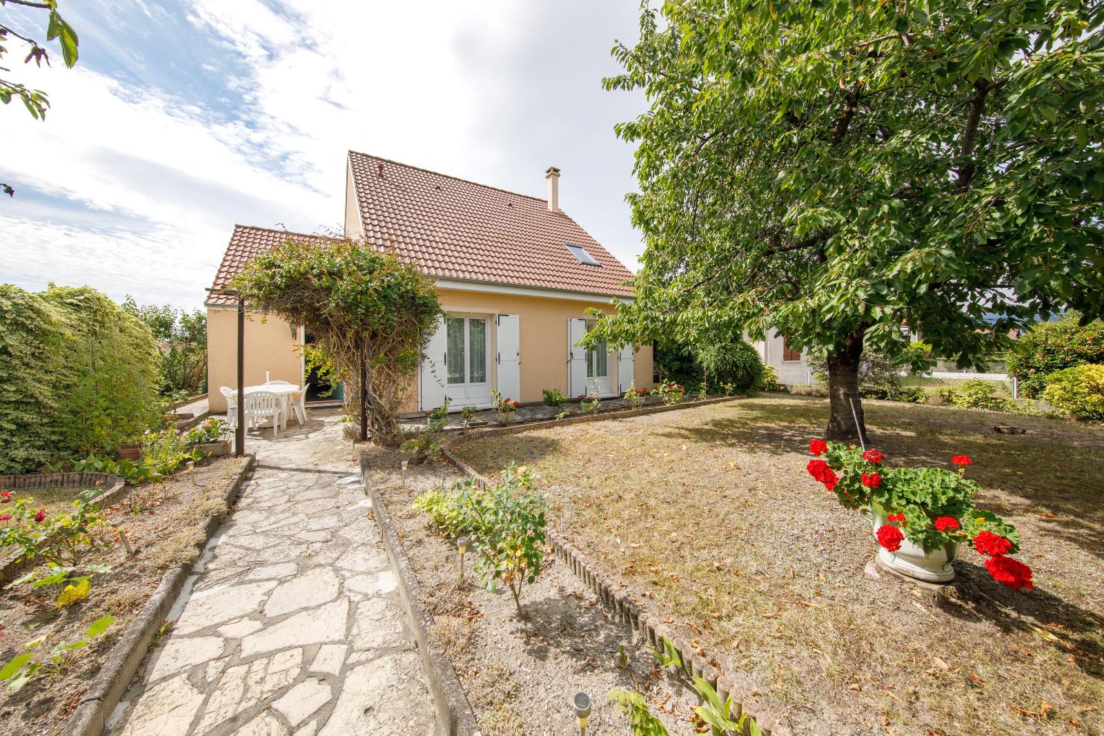Un extérieur agréable et intime : une terrasse idéale pour les repas en extérieur, et un jardin soigné propice à la détente et aux moments en famille.