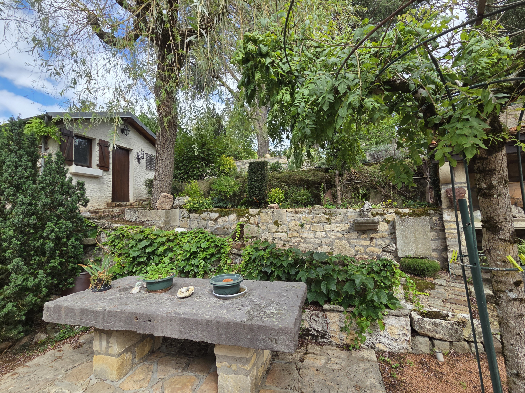 Au sous-sol : dégagement avec rangement, deux pièces, salle d'eau avec WC, buanderie/chaufferie gaz (Viessmann 10 ans), cellier, cave à vin. Garage séparé, petites dépendances, le tout sur superbe terrain arboré de 1700 m2 aménagé en terrasses offrant un environnement dépaysant. Prévoir travaux de modernisation et remise aux normes.