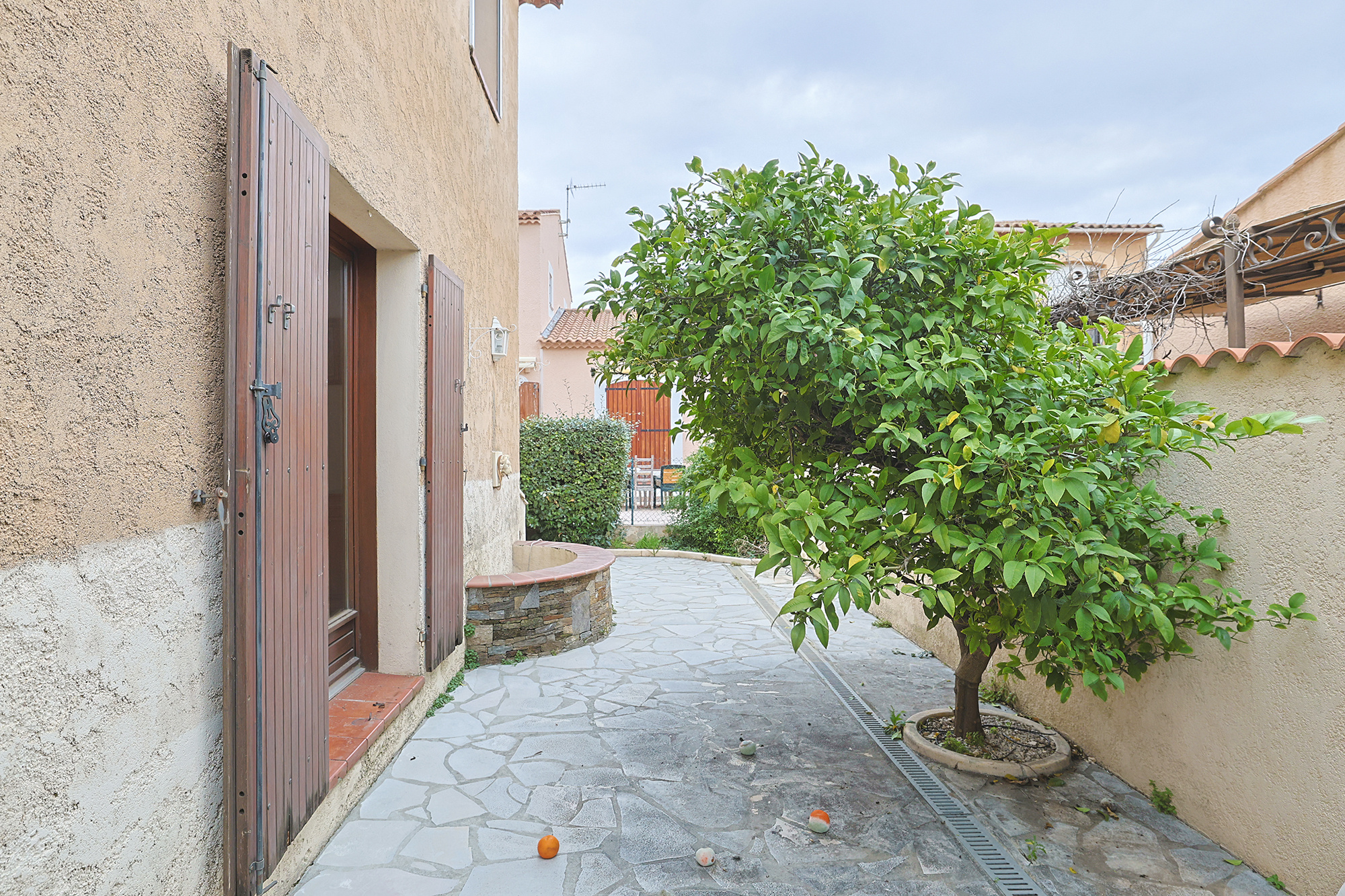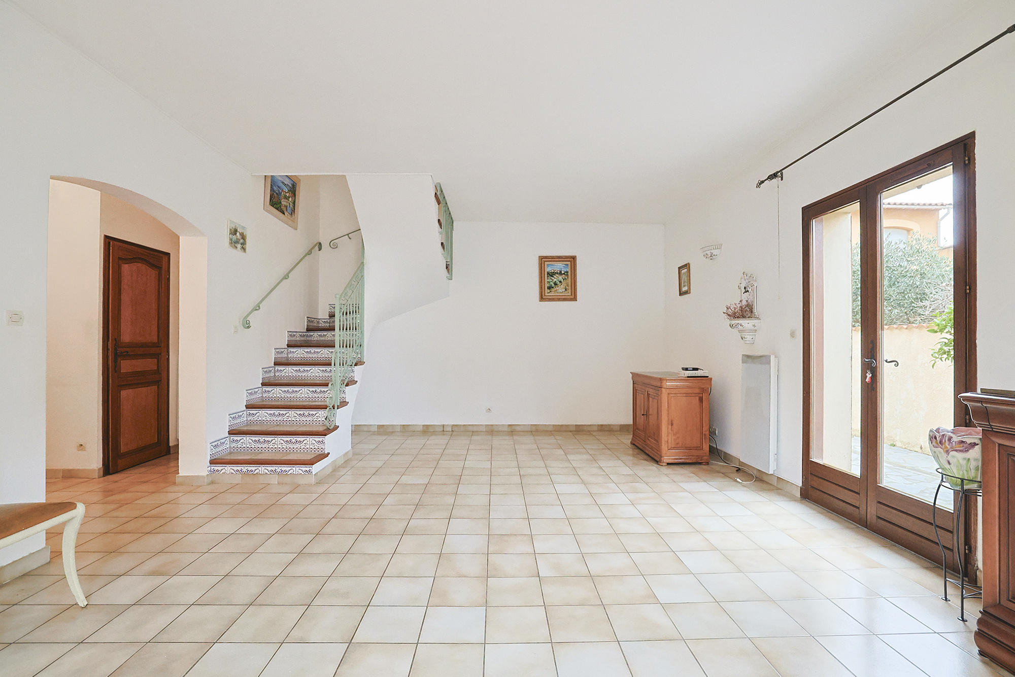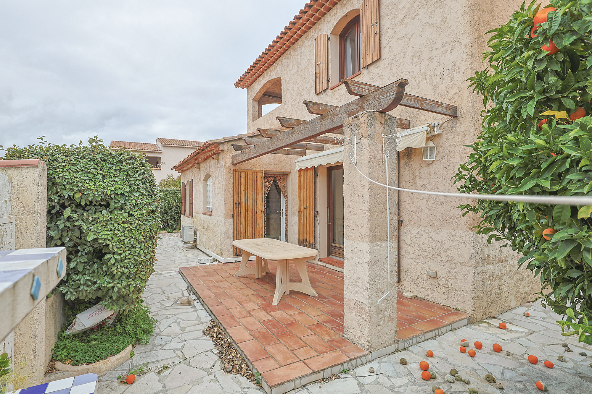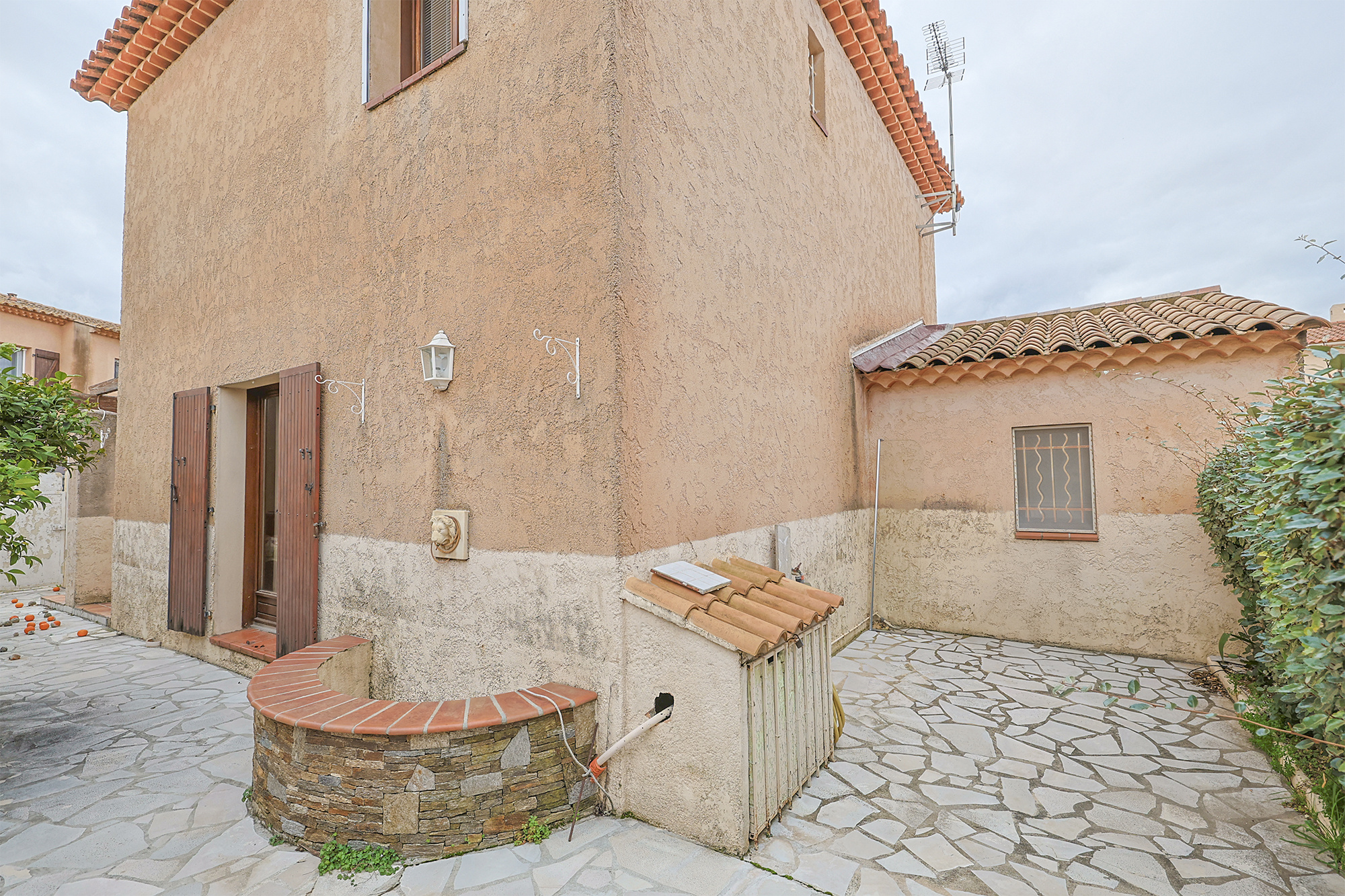 Hyères au calme en lotissement villa traditionelle de Type T4 de 100 M2 sur deux niveaux . Elle se compose au rdc: d'une entrée, un wc séparé, une buanderie avec accès direct au garage de 18 m2 . Un Séjour avec très belle hauteur de plafond. Une cuisine séparée. Une chambre de plain pied avec salle d'eau . A l'étage: un dégagement, un bureau , 2 autres chambres avec salle d'eau et accès à une terrasse couverte, wc séparée . Dressing. double vitrage, climatisation reverssible. Terrain arboré de 278 m2 . Exposition EST /OUEST .