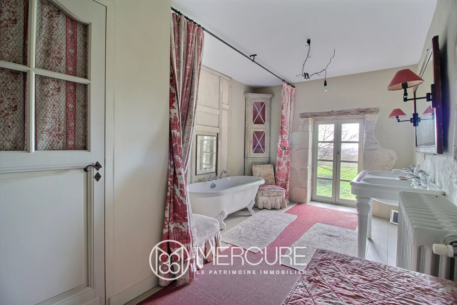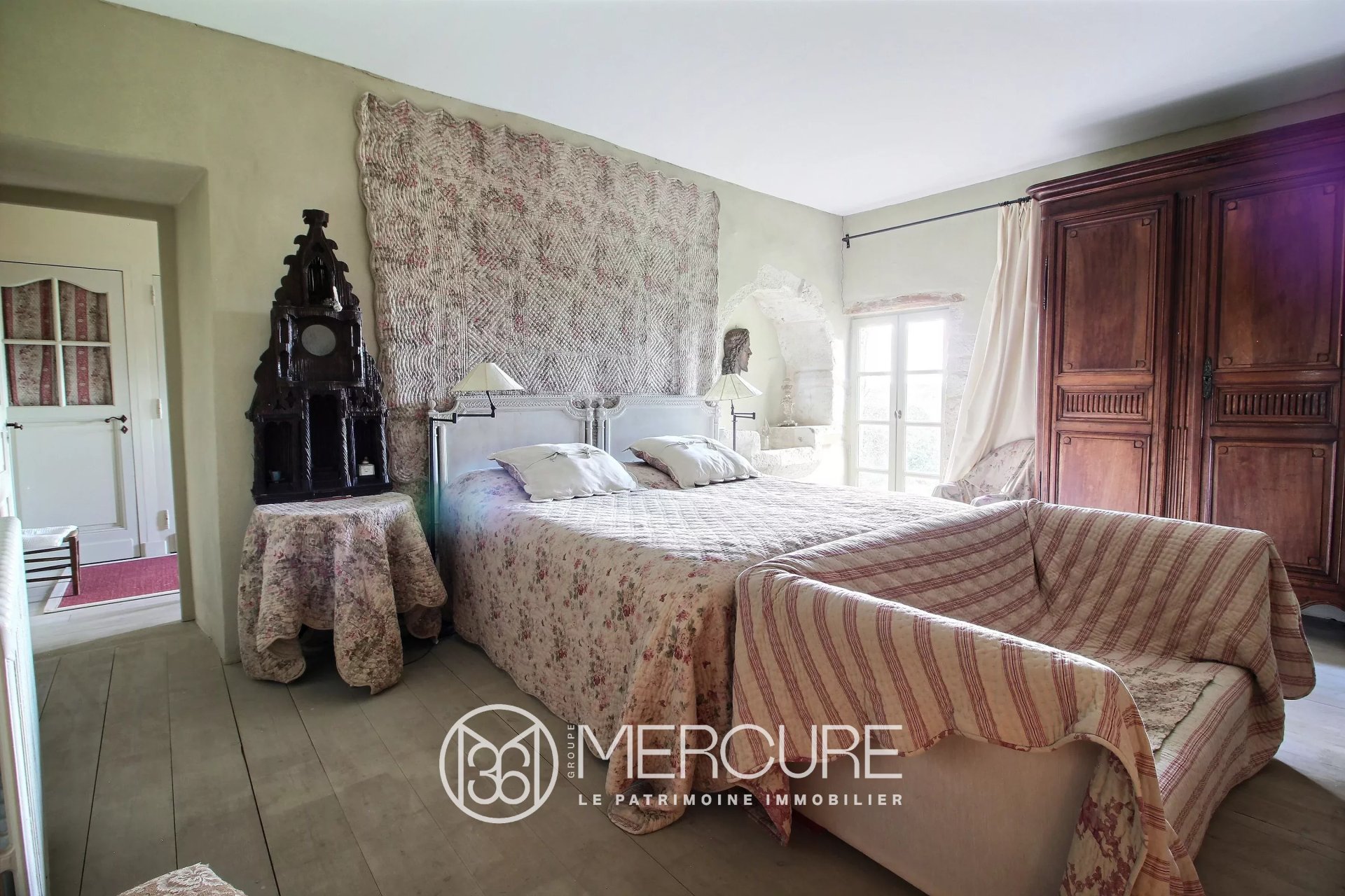 L’étage, desservi par un escalier en pierre, intégré dans l’épaisseur d’un mur, est composé d’une grande chambre et sa vaste salle de bains avec toilette et dressing.