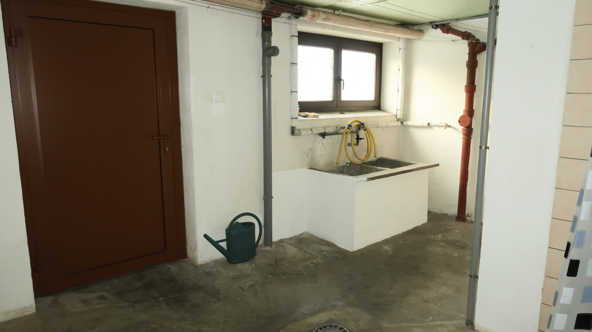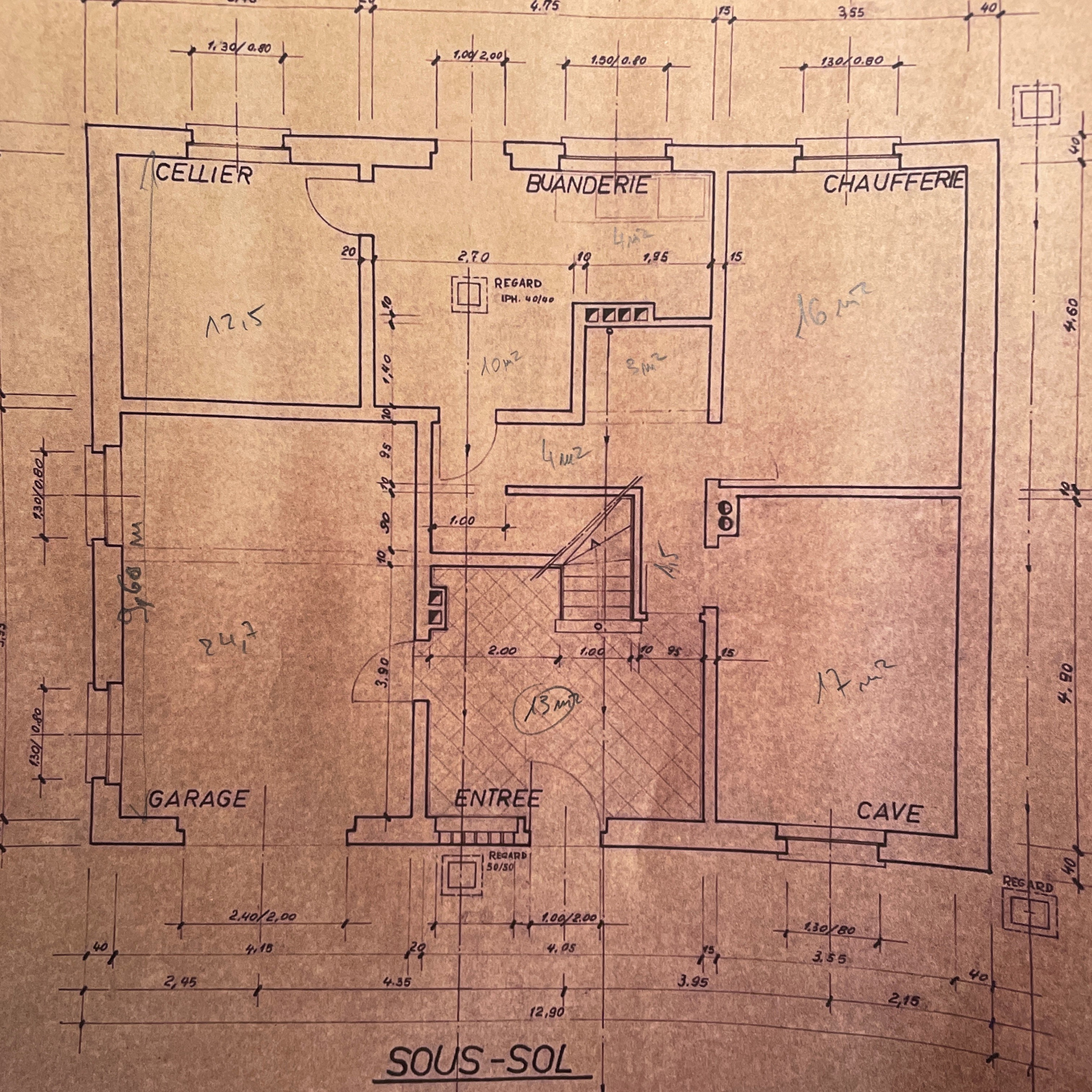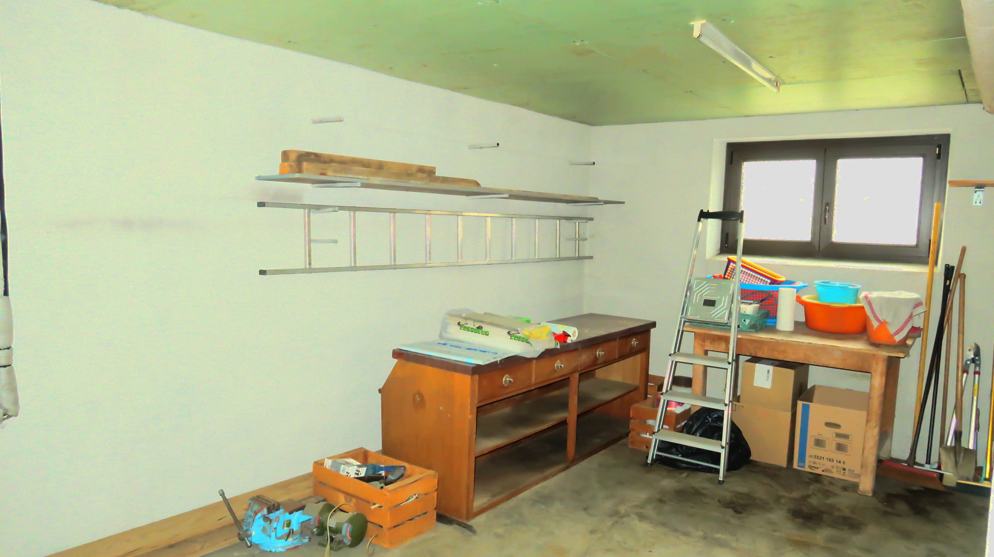 On trouve une entrée avec escalier menant à l'étage, un bureau, une chaufferie lingerie, un atelier, une buanderie avec coin douche ainsi qu'un grand garage avec porte motorisée et portillon.