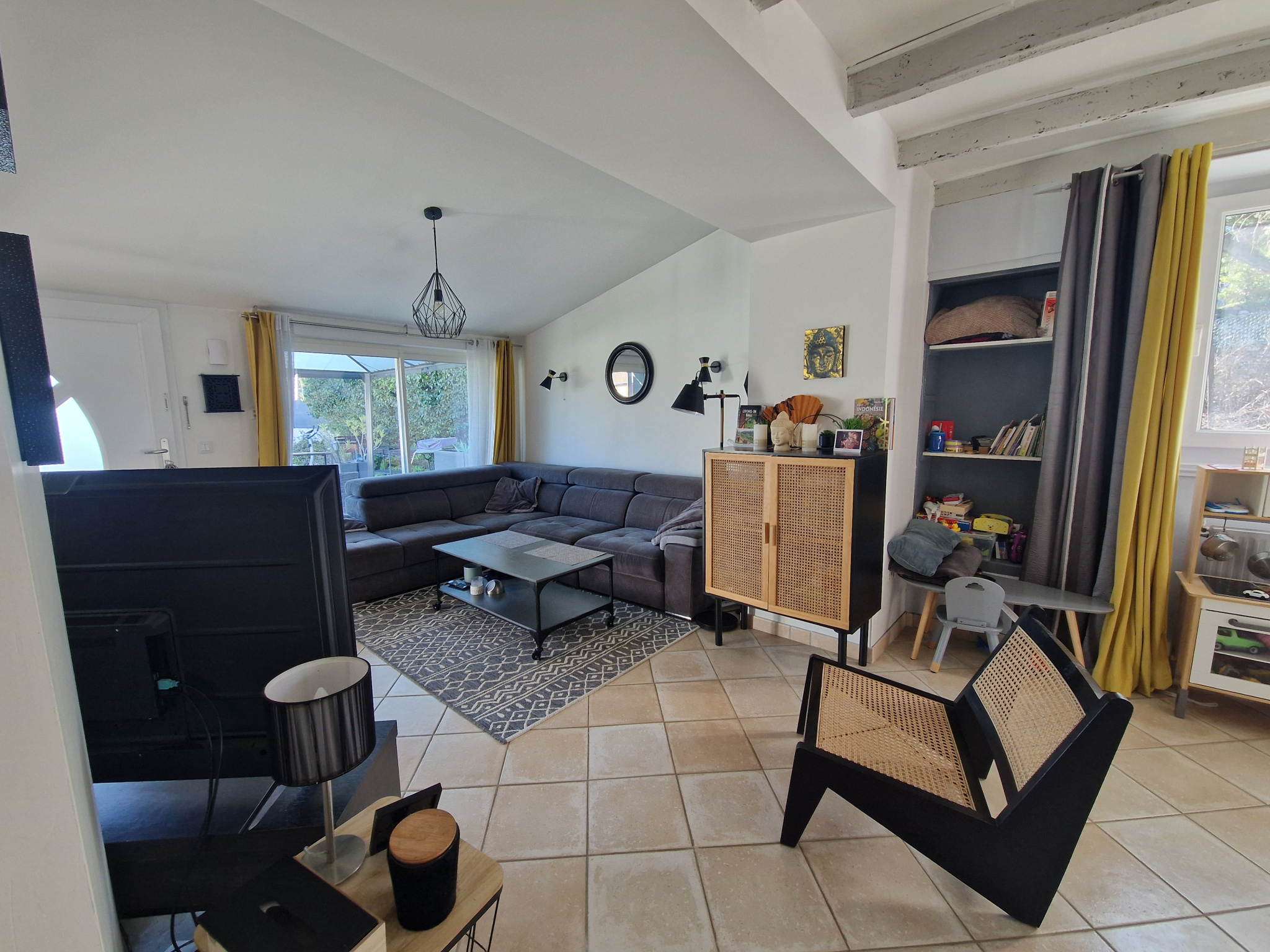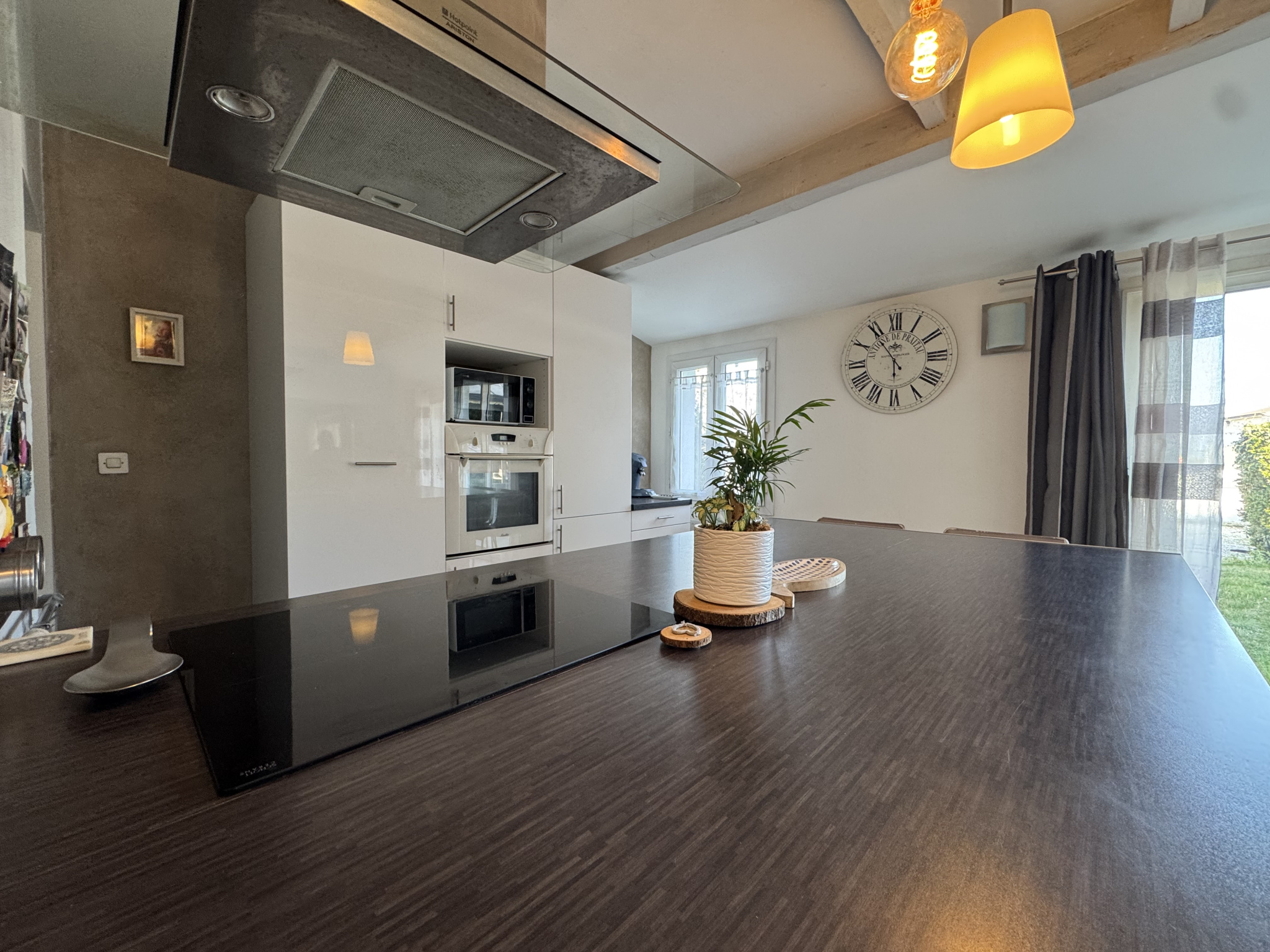 La maison s'ouvre ensuite sur une pièce de vie de près de 60 m2, lumineuse et tournée vers le jardin. La cuisine, s'intègre parfaitement à cet espace convivial, pensé pour partager de vrais moments en famille ou entre amis. Elle bénéficie d'une arrière cuisine qui comporte un réel plus pour du rangement ou un buanderie.