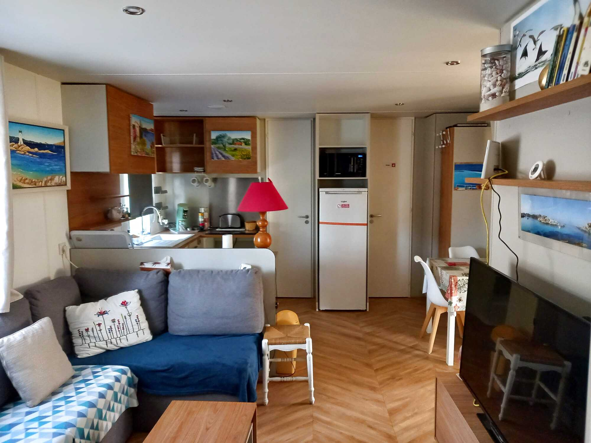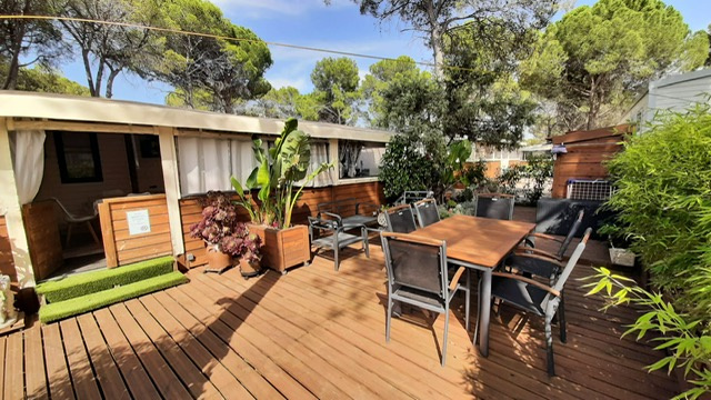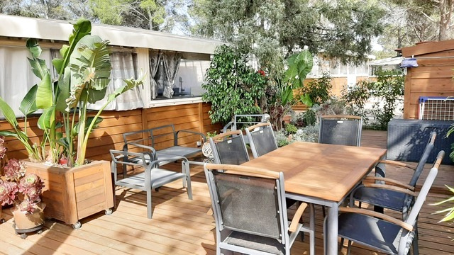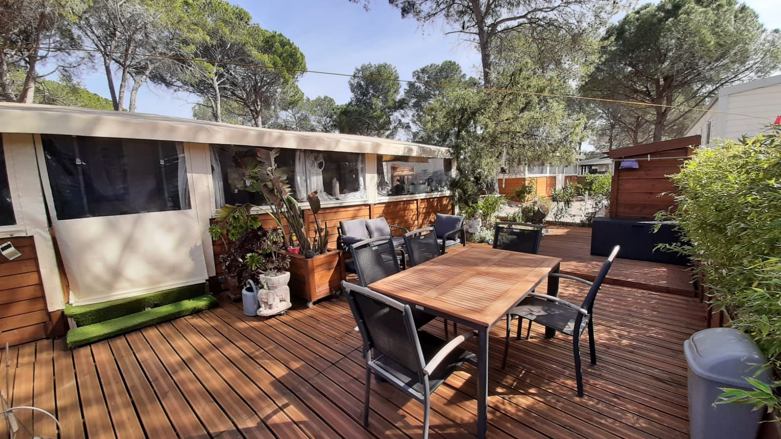 83480 Puget sur Argens. Situé au Parc Saint James, disposant de toutes les commodités et services (4 piscines dont 1 chauffée à partir d'avril), jacuzzi, balnéo, toboggan, salle de fitness, minigolf, terrain de foot, tennis, 2 padels, terrain de boules, supérette, restaurant, animations. Très beau Mobil-home de 2020 de marque IRM modèle Petit Paradis (40 m2) climatisé comprenant un séjour, une cuisine équipée, 1 chambre parentale avec dressing, 2 autres chambres, 1 salle d'eau, 1 wc, une belle terrasse couverte, fermée et isolée de 25 m2 environ. Vendu meublé et tout équipé sur une belle parcelle arborée .