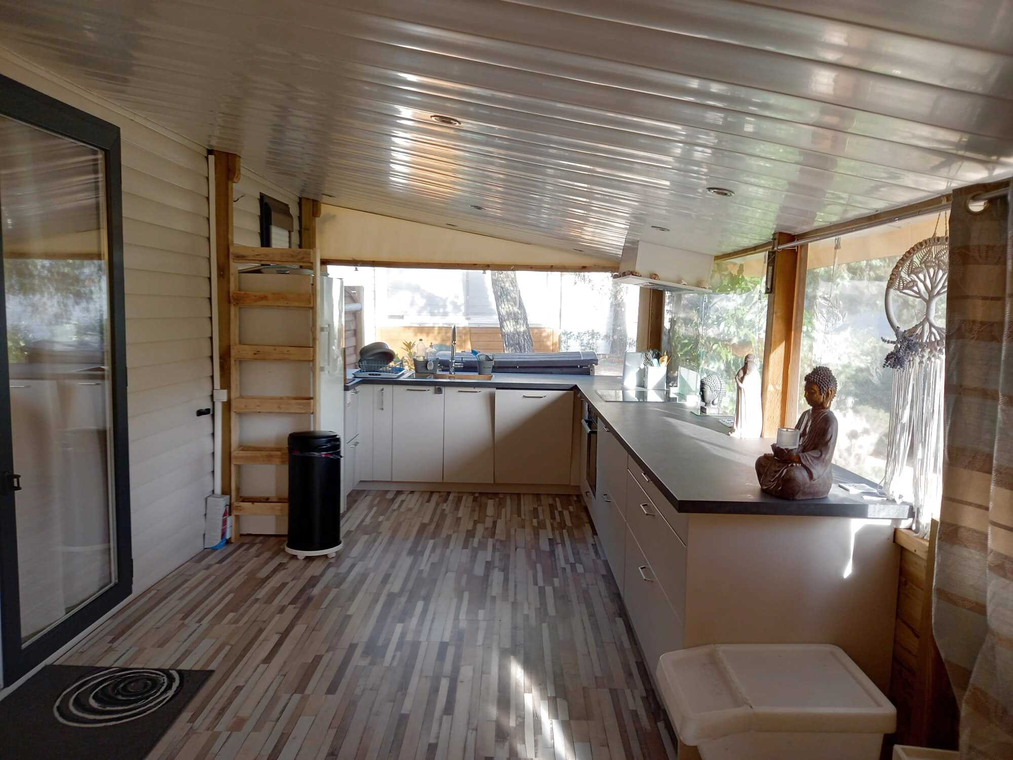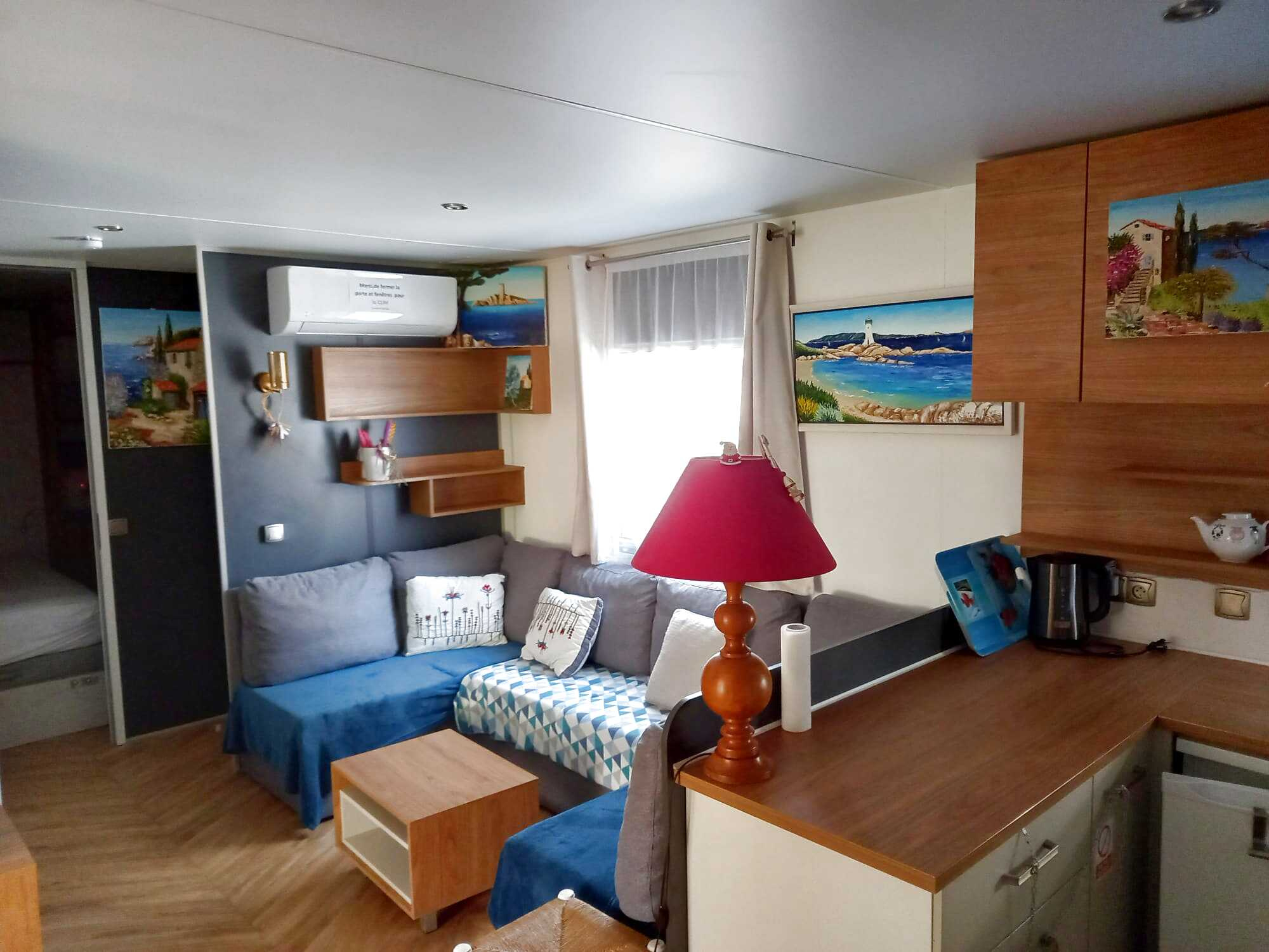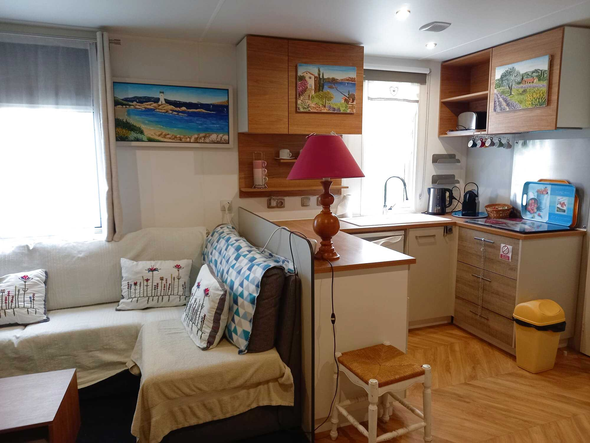 83480 Puget sur Argens. Situé au Parc Saint James, disposant de toutes les commodités et services (4 piscines dont 1 chauffée à partir d'avril), jacuzzi, balnéo, toboggan, salle de fitness, minigolf, terrain de foot, tennis, 2 padels, terrain de boules, supérette, restaurant, animations. Très beau Mobil-home de 2020 de marque IRM modèle Petit Paradis (40 m2) climatisé comprenant un séjour, une cuisine équipée, 1 chambre parentale avec dressing, 2 autres chambres, 1 salle d'eau, 1 wc, une belle terrasse couverte, fermée et isolée de 25 m2 environ. Vendu meublé et tout équipé sur une belle parcelle arborée .