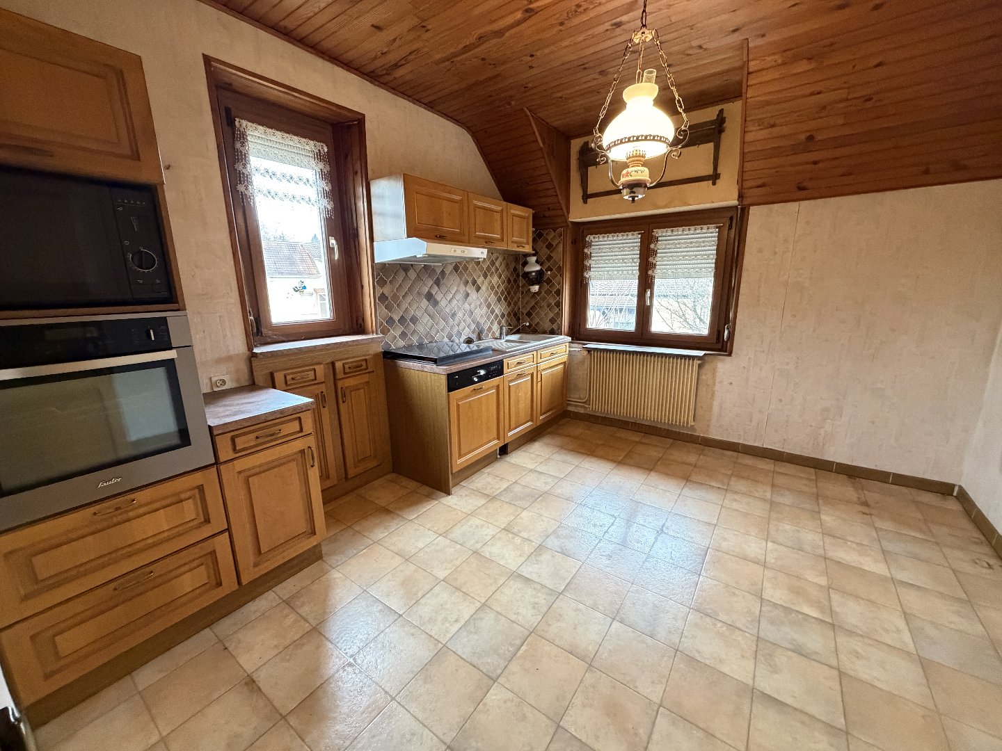 Etage : Appartement type T5 avec cuisine equipée, salon sejour, salle de bains, 3 chambres, wc, combles au dessus.