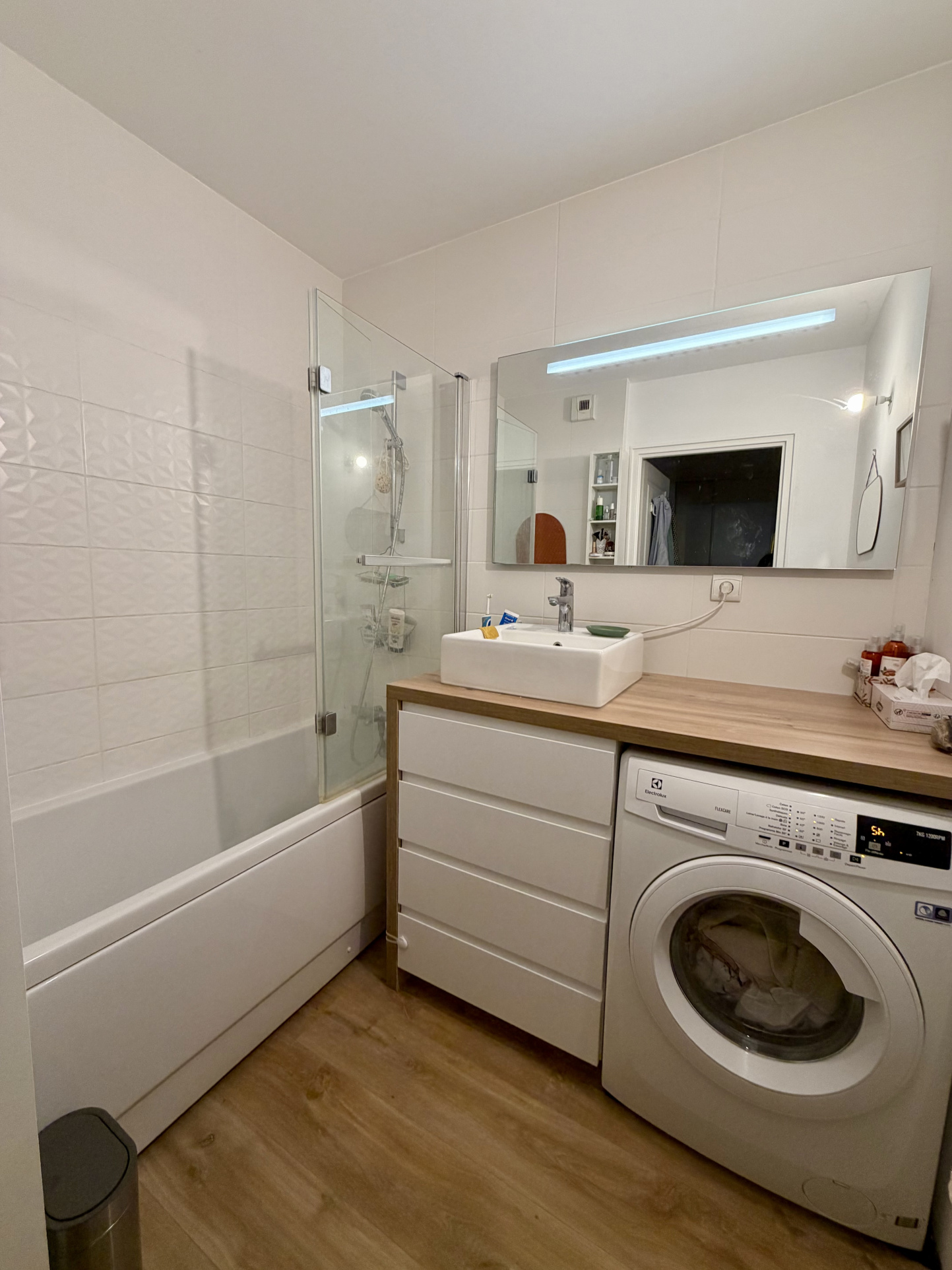 Celui-ci est composé d'une entrée, une pièce avec salon/séjour et cuisine ouverte de 29,17m2, un couloir avec un grand placard desservant 2 chambres (une avec placard de 9,14m2 et une de 8,51m2), une salle de bains avec emplacement machine à laver et un wc séparé.