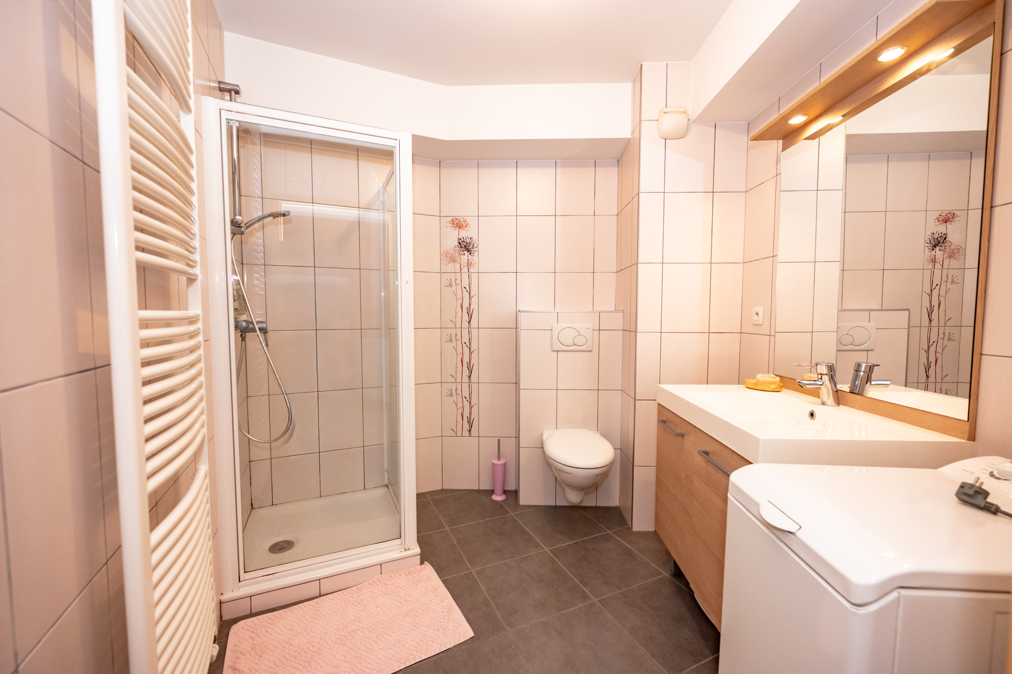 PONTARLIER - LES EPINETTES : Résidence EDEN PARC, appartement haut standing de type 2 dans une petite copropriété calme de 2009 avec ascenseur comprenant entrée avec placard, cuisine ouverte sur séjour avec accès terrasse de 17m2, chambre, salle d'eau - WC, cave et parking privé en sous-sol. Chauffage collectif avec PREVAL, VMC doube flux, DPE en C.