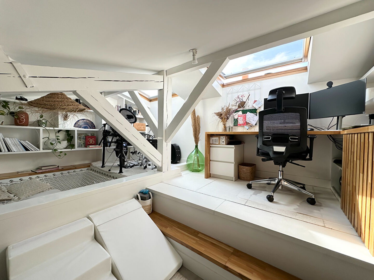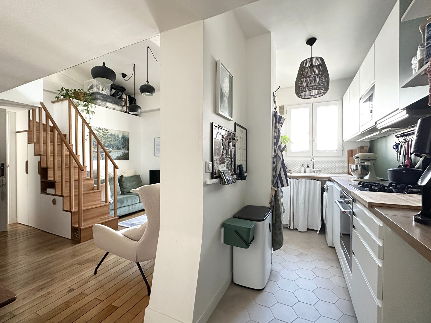 Paris 18ème Marx Dormoy - rue Boucry. Au 5ème et dernier étage sans ascenseur, superbe 3 pièces de 50,71 m2 loi carrez et 68,70 m2 au sol. Dès l'entrée vous serez sous le charme de cet appartement en parfait état. Il se compose d'un séjour avec espace salon et salle à manger, d'une cuisine semi-ouverte aménagée et équipée, d'une salle de bain avec water-closet et d'une chambre avec rangements. A l"étage supérieur sous les combles un bel espace ouvert comprenant solarium, bureau et chambre. Chaudière individuel au gaz. cave en sous-sol et jardin partagé avec emplacement vélos - Appartement baigné de lumière, au calme et en parfait état ! Un vrai cocon !