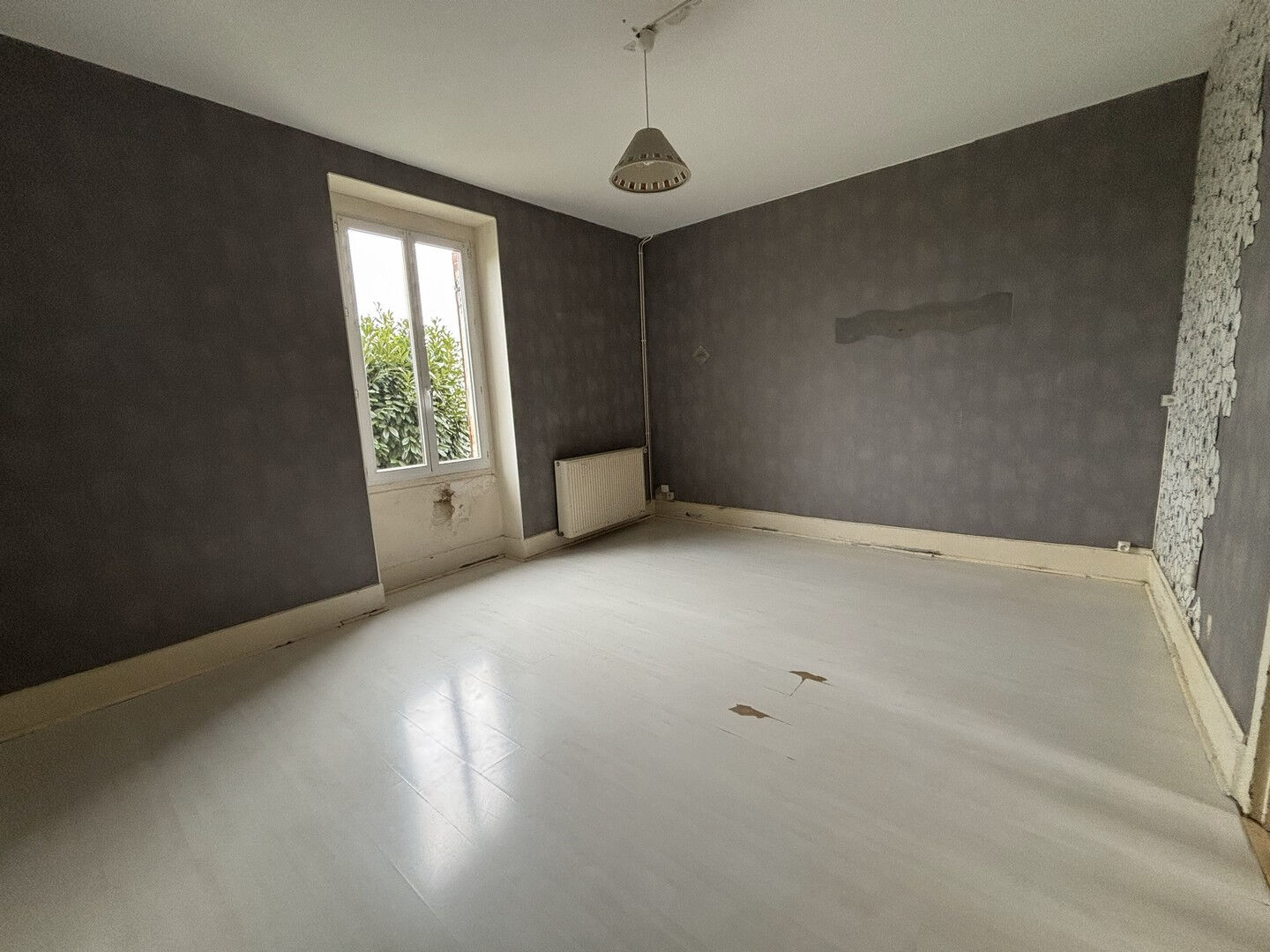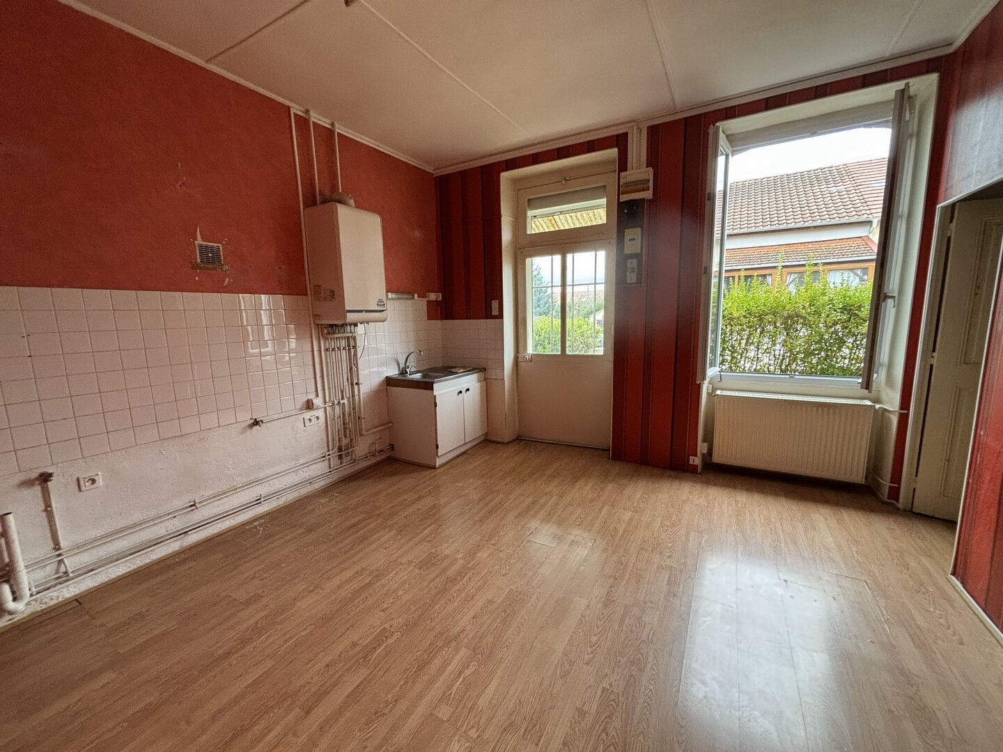 Maison mitoyenne : véranda, cuisine, WC, salle d'eau, séjour. Etage : 1 chambre et 2 petites pièces. CC gaz. Cave. Garage. Jardin de 596 m² env. Quartier calme.