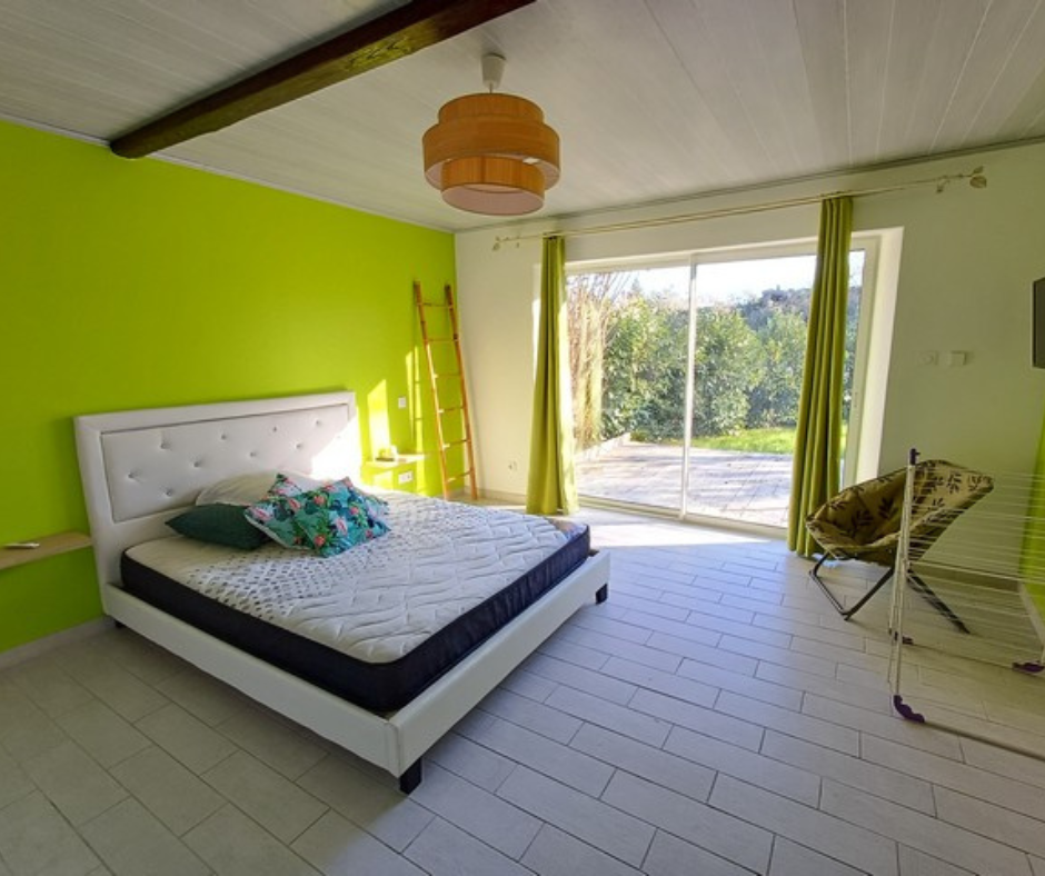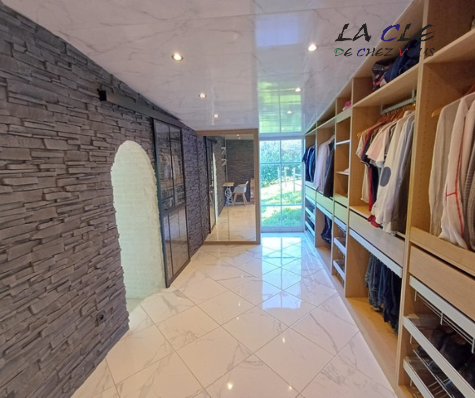 Cette maison ancienne est composée au rez-de-chaussée d'une belle pièce de vie avec cuisine équipée, une chambre avec dressing privatif et une salle de sport, une salle de bains, une buanderie et des toilettes.
