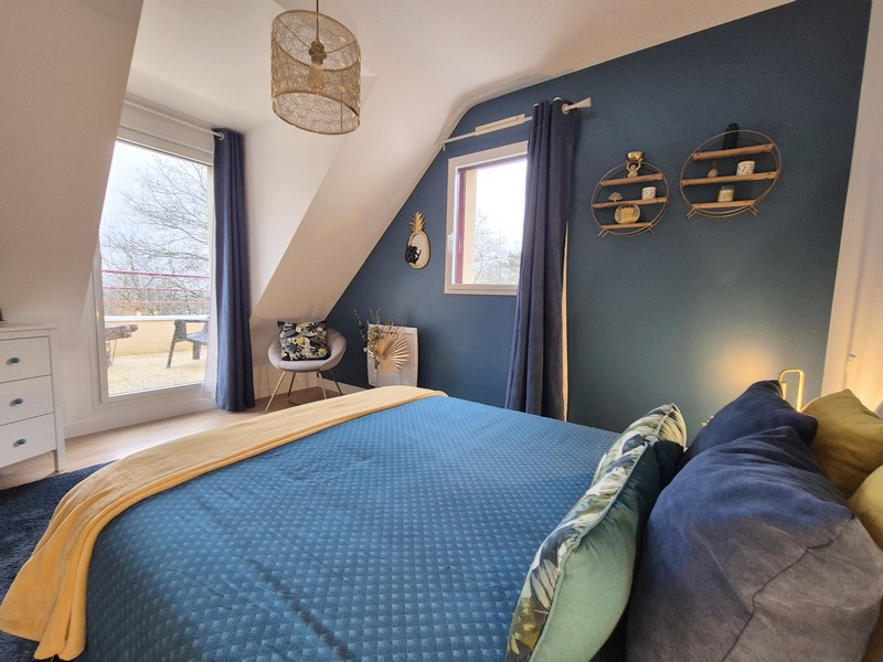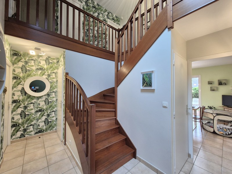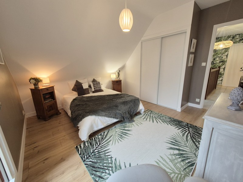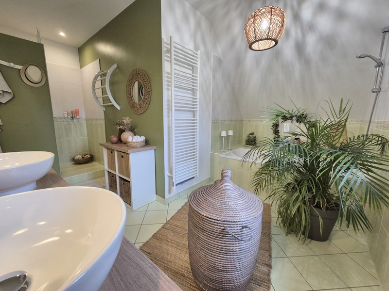 De construction traditionnelle, lumineuse et aux prestations de qualité, elle vous offre au rez-de-chaussée : une entrée avec placard, un salon-séjour avec poêle à bois et ouvrant sur la terrasse, une cuisine aménagée et équipée avec accès à la terrasse ,une arrière-cuisine aménagée, une chambre avec placard et sa salle d'eau privative, un wc avec lave-mains, un rangement, 2 garages.