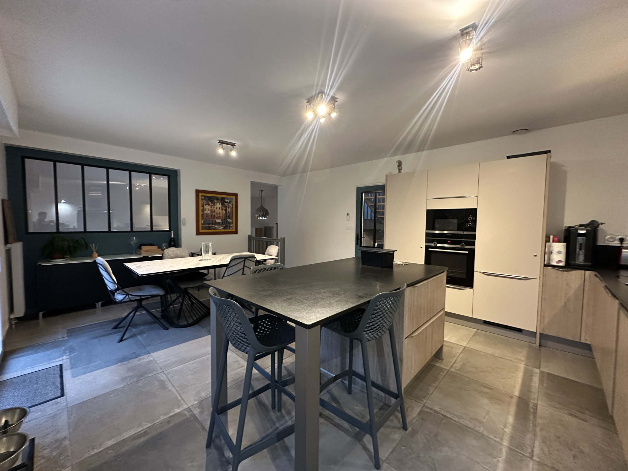 Cuisine dinatoire de 29 m2 et salon attenant de 32 m2, les deux pièces s'ouvrant sur une vaste terrasse exposée OUEST, avec vue sur le terrain et un environnement arboré.