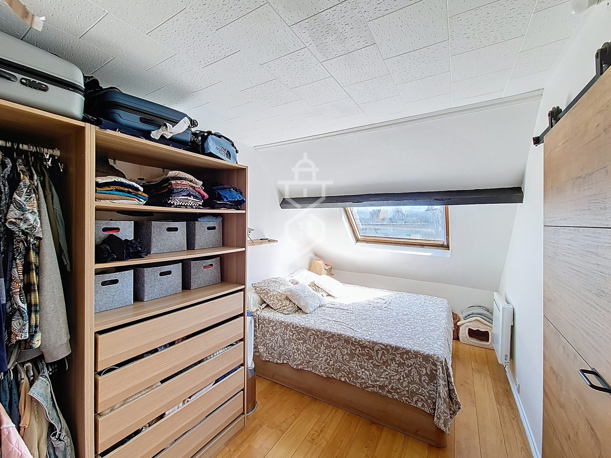 L'escalier colimaçon qui vient desservir l'étage amène ce côté atypique et cette touche de charme à cet appartement. L'étage se compose d'une chambre, d'un bureau pouvant faire office de petite chambre, d'une salle d'eau avec WC et d'un couloir avec des rangements.
