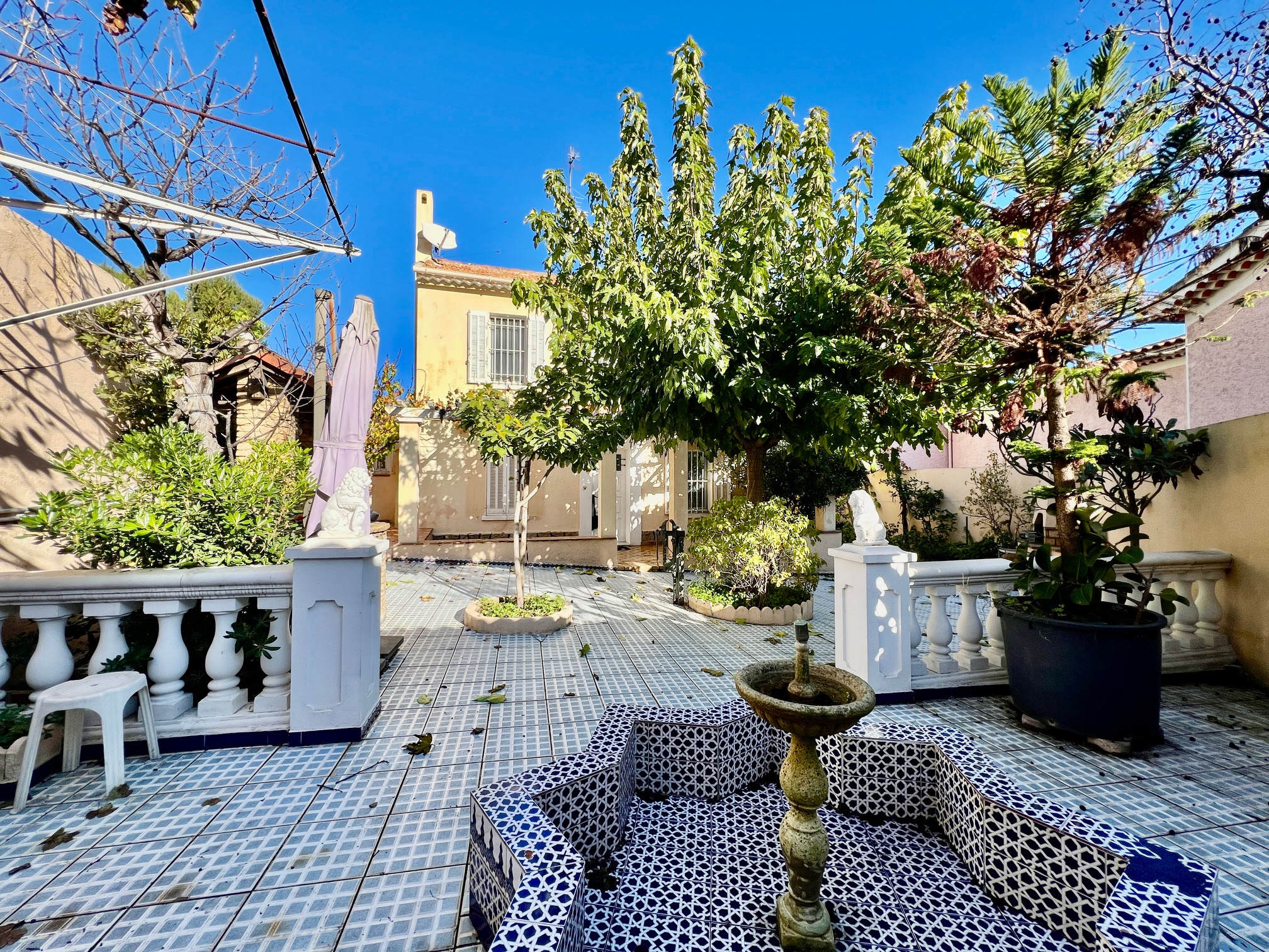 SIX-FOURS-LES-PLAGES, VILLA T6 AVEC GARAGE ET DEPENDANCE proche commerces et transports, 4 chambres dont une de plain-pied, séjour, cuisine, salle d'eau, WC, bureau et buanderie, belle terrasse plein sud avec treille et vigne vierge, puits, grande pièce aménagée au fond du jardin, 2 fontaines, 3 stationnements.