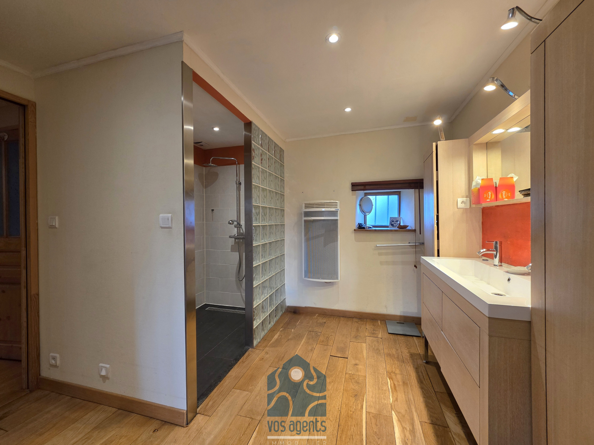 En rez-de-chaussée, une grande entrée dessert une cuisine semi-équipée de 25m2 depuis laquelle vous pourrez accéder à un double-salon de 35m2. De l'autre côté du couloir d'entrée se trouvent une suite parentale avec espace dressing et douche pour un total de 30m2 avec WC séparé. Une buanderie et plusieurs rangements complètent ce niveau.