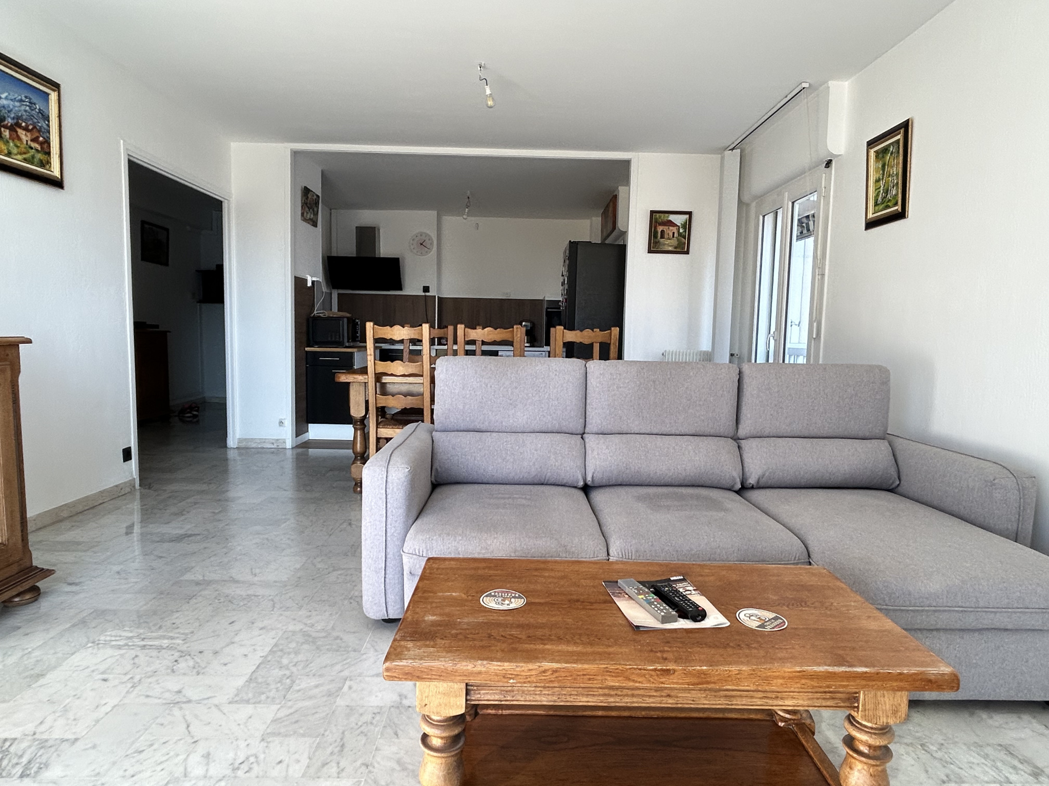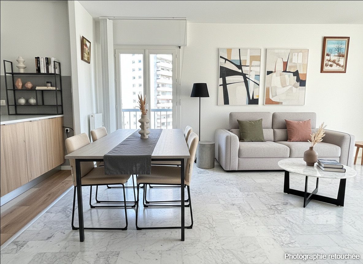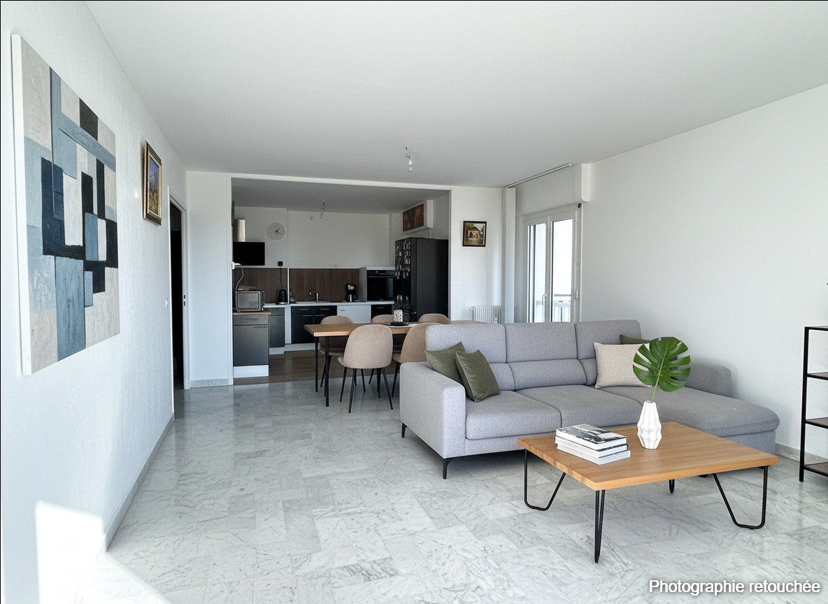 Vous apprécierez son agencement parfait, l'entrée distribue la partie à vivre composée du grand séjour double exposé SUD ouvrant sur la longue terrasse, la cuisine ouverte équipée et meublée bénéficiant de son propre extérieur.