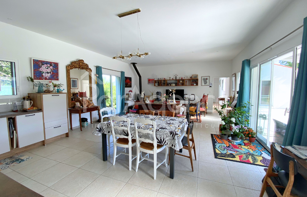 Le rez-de-chaussée se compose d'une entrée avec placard, d'un WC et d'une buanderie, ouvrant sur un salon-séjour traversant de 54 m2 avec cuisine ouverte aménagée et équipée, donnant directement sur la terrasse et la piscine. Le dégagement dessert trois chambres, une salle d'eau et un second WC. Une grande pièce attenante de 47 m2, idéale en atelier ou bureau, bénéficie également d'un accès direct à l'extérieur. Le garage attenant complète les prestations et le terrain permet le stationnement de plusieurs véhicules. Le chauffage au sol par pompe à chaleur assure un confort optimal tout au long de l'année.
