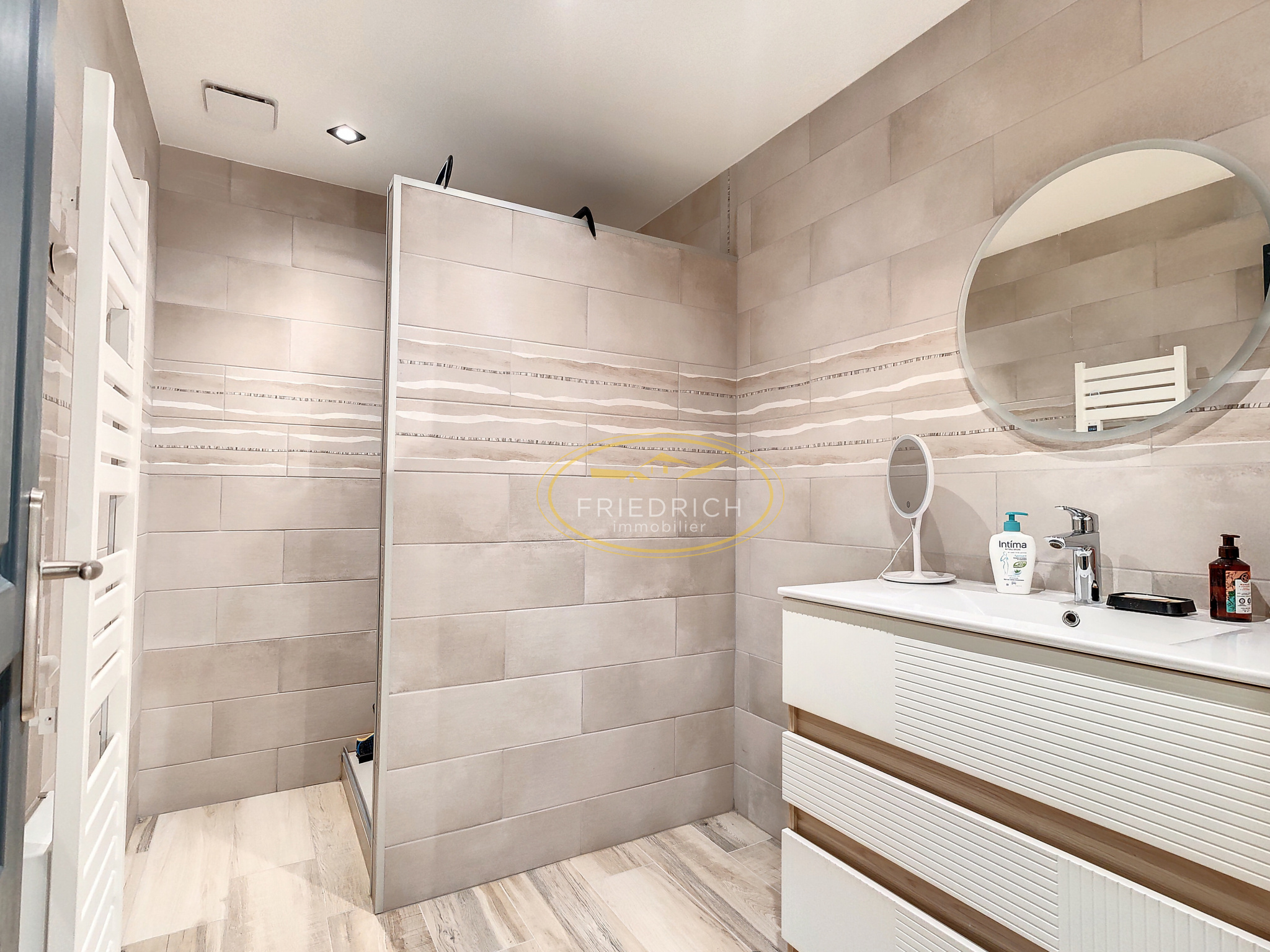 - Salle d'eau (5,22 m2) : sol carrelage, sèche serviettes électrique, VMC ;