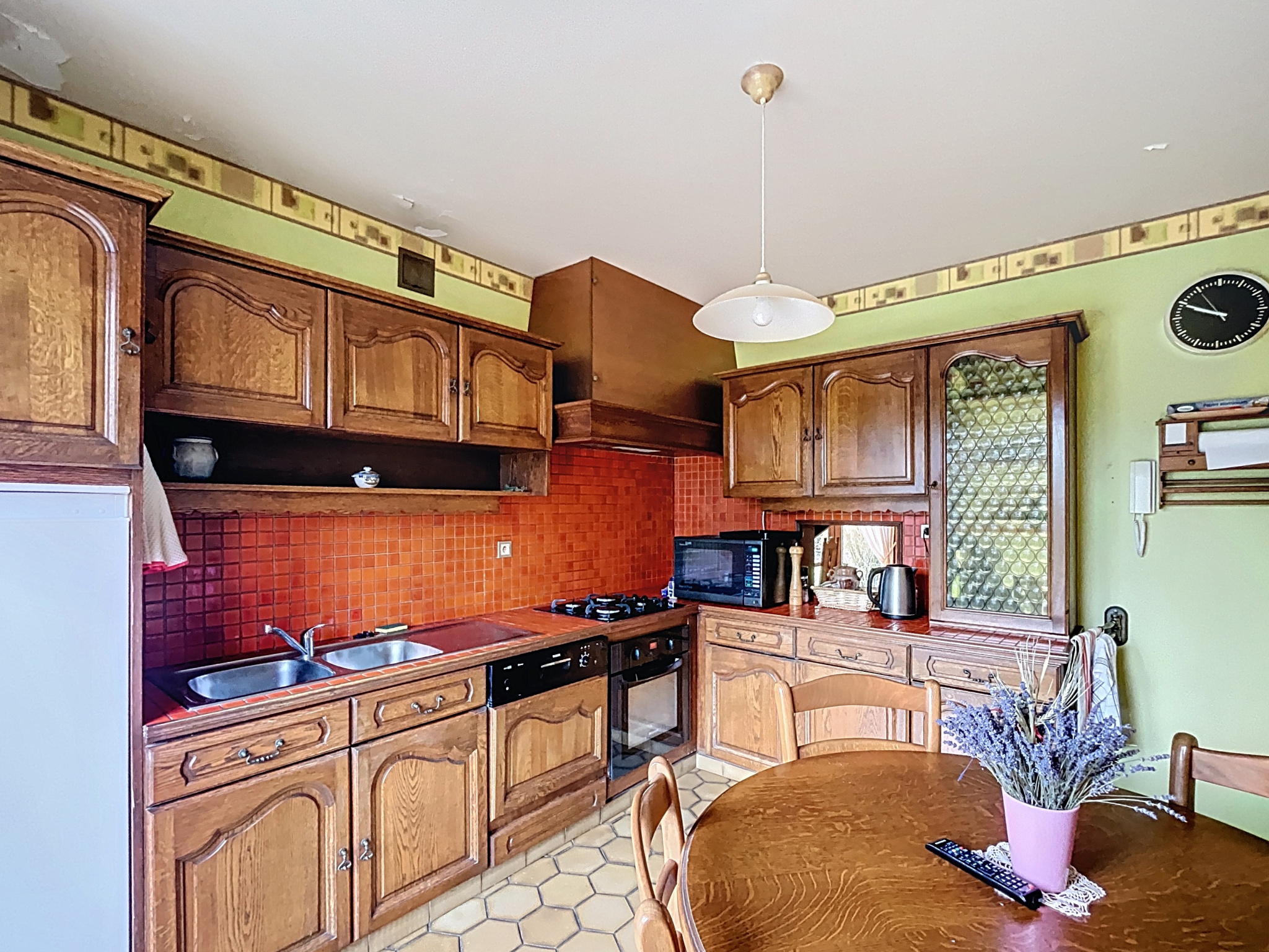- Cuisine (10,49m2) : carrelage, cuisine chêne avec éléments de rangement haute et bas, four, plaque, lavabo double bac, convecteur, porte-fenêtre ;