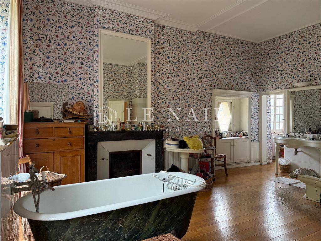 A l’étage, un grand couloir dessert : 5 chambres (27, 26, 22, 18 et 16 m²), 2 salles de bains et de douches, 1 salle d’eau, wc.