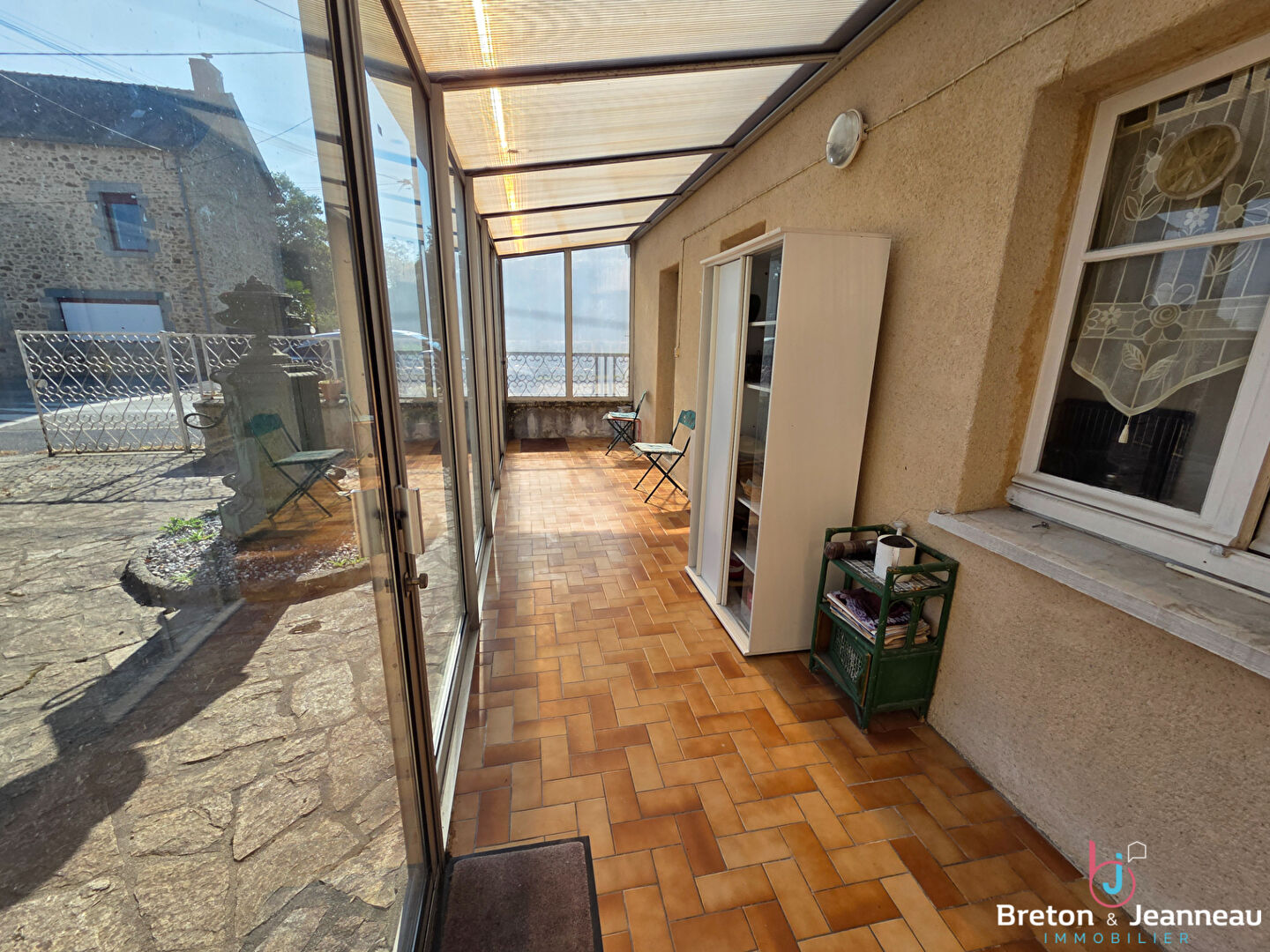 La maison dispose également d'une véranda située devant la cuisine avec baie coulissante, d'une cour carrelée à l'avant, d'un jardin à l'arrière avec puits sans vis-à-vis, d'une cave, de deux bâtiments annexes et d'un garage en préfabriqué.