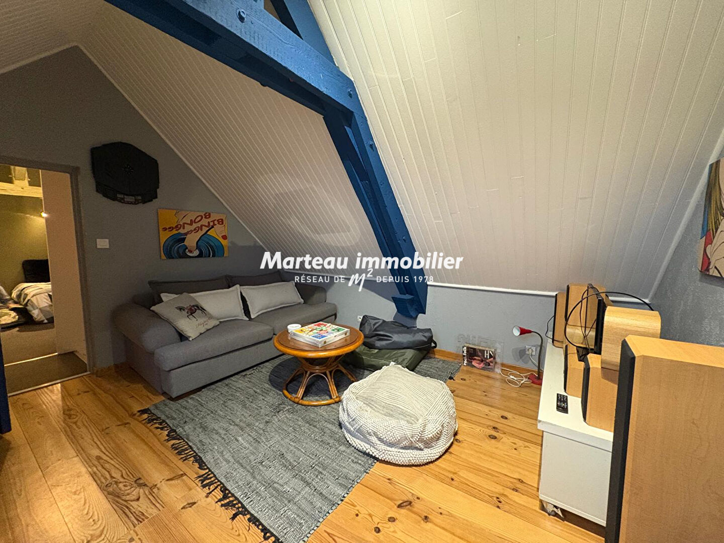 La pièce de vie, véritable coeur de la maison, séduit par sa luminosité et son poêle à bois, invitant à des instants de convivialité dans un cadre élégant.
