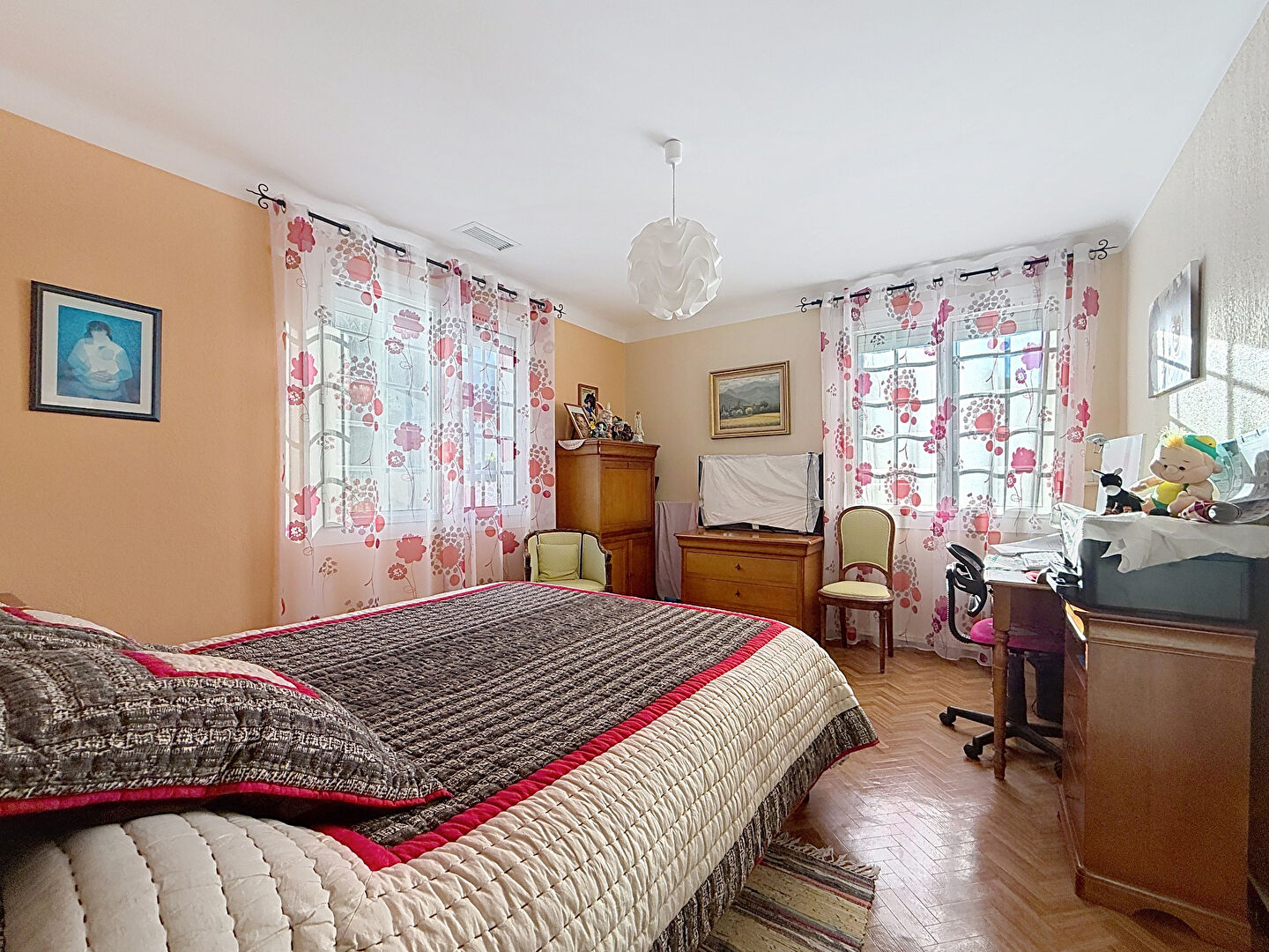 La maison dispose de 5 chambres, dont une suite en rez-de-chaussée avec salle d'eau, idéale pour une vie de plain-pied ou pour accueillir famille et invités en toute autonomie.