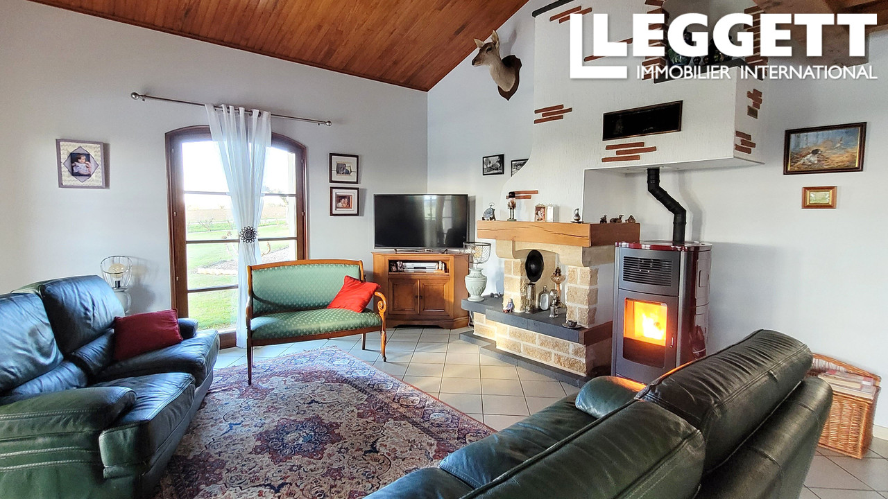 La pièce de vie est équipée d'un poêle à granulés, offrant une chaleur douce et économique tout au long de l'année.