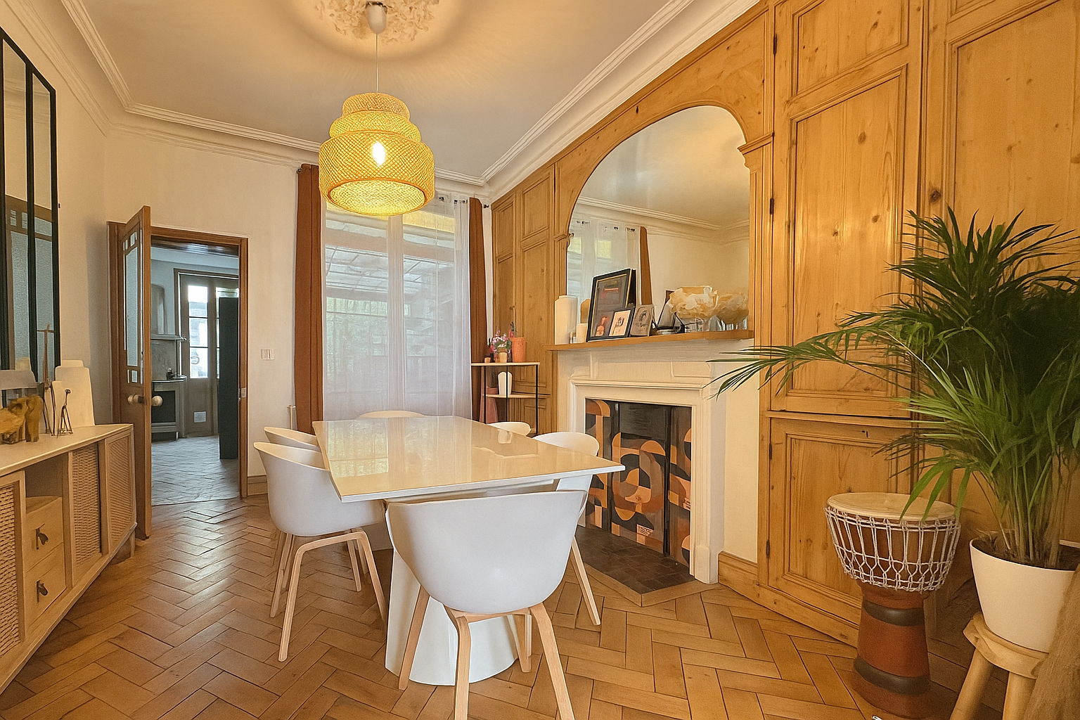 Cette maison ayant gardé son cachet d'origine se compose d'une belle entrée avec carreaux de ciments, double séjour avec cheminée, cuisine spacieuse, véranda et accès à l'espace extérieur d'environ 50 m2.