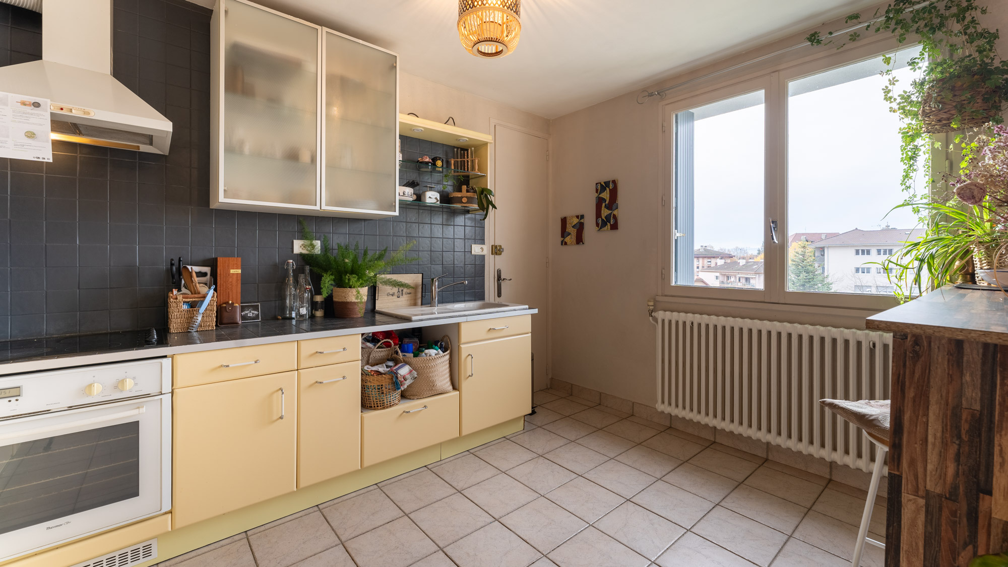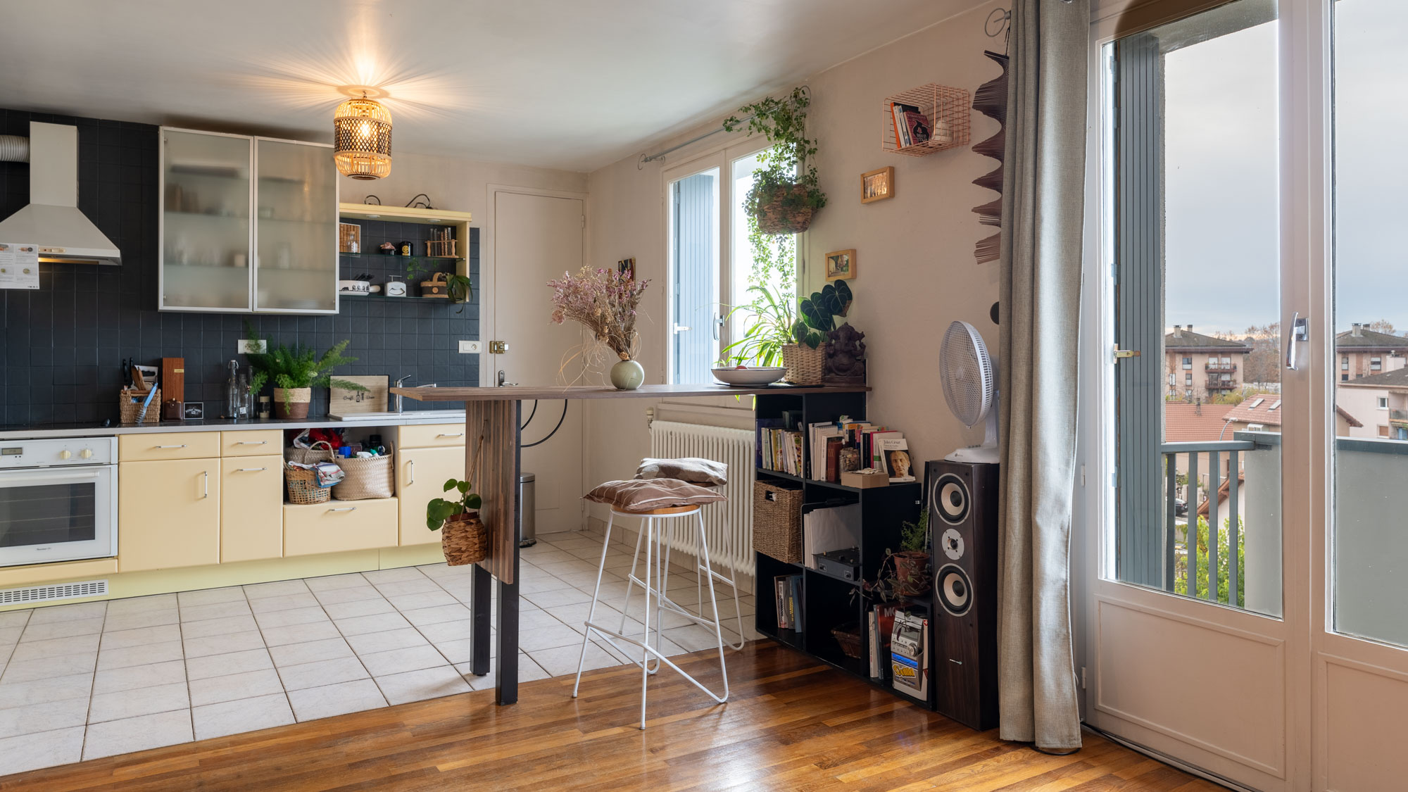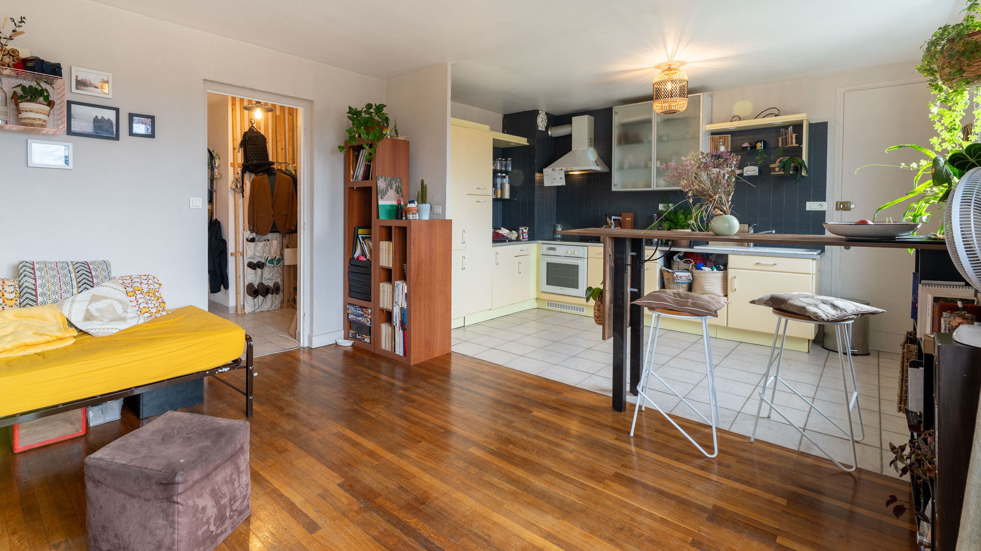 La pièce de vie lumineuse, composée d'un séjour chaleureux et d'une cuisine ouverte, offre un accès direct à un balcon exposé Ouest. Vous profiterez ainsi d'une vue dégagée sur les toits de la ville et de magnifiques couchers de soleil. Une loggia attenante à la cuisine vient compléter cet espace convivial.