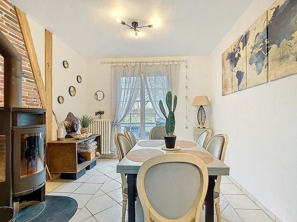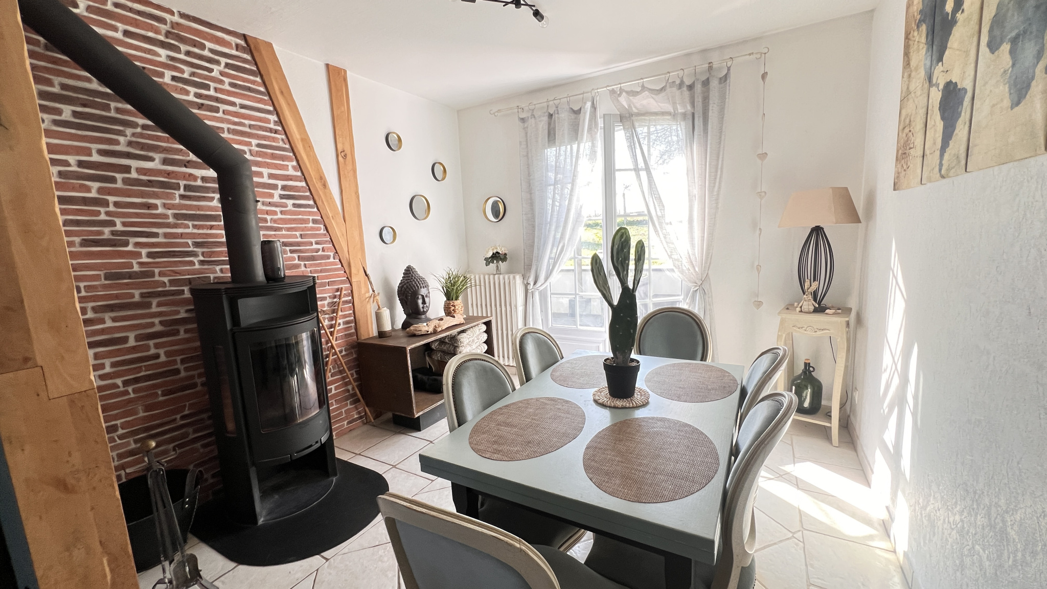 Entrée avec placard, cuisine aménagée et équipée, salon/salle à manger traversant et lumineux avec poêle à bois norvégien, donnant accès à la terrasse, deux chambres, une salle d'eau et WC séparés.