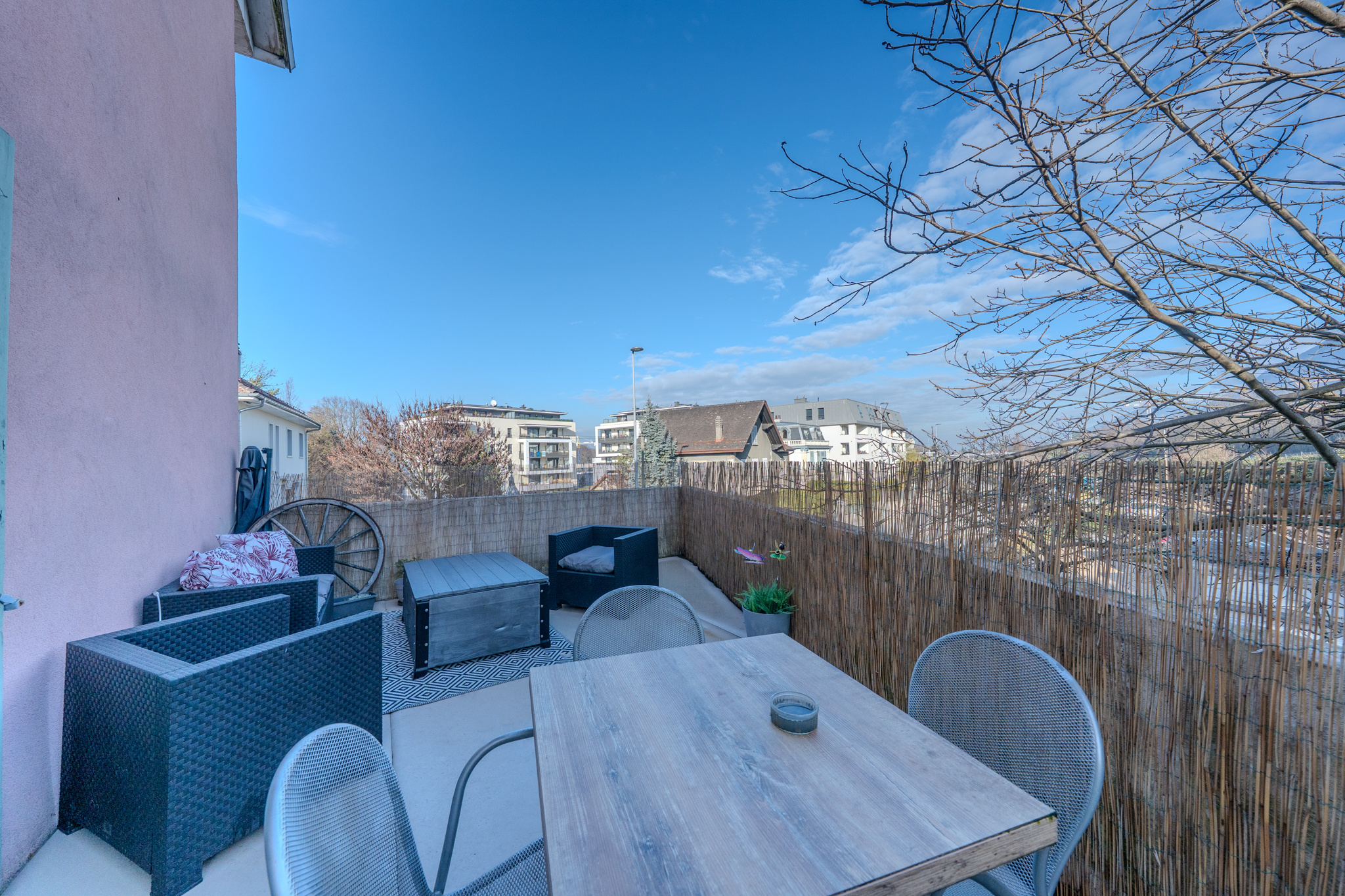 L'appartement bénéficie d'une terrasse avec vue sur le Salève, offrant un espace extérieur agréable et fonctionnel au quotidien.