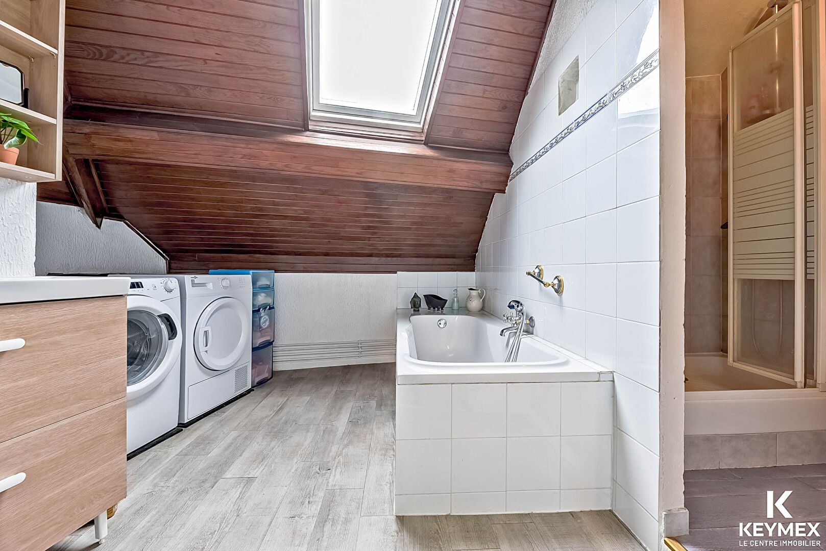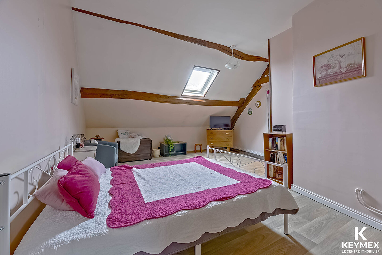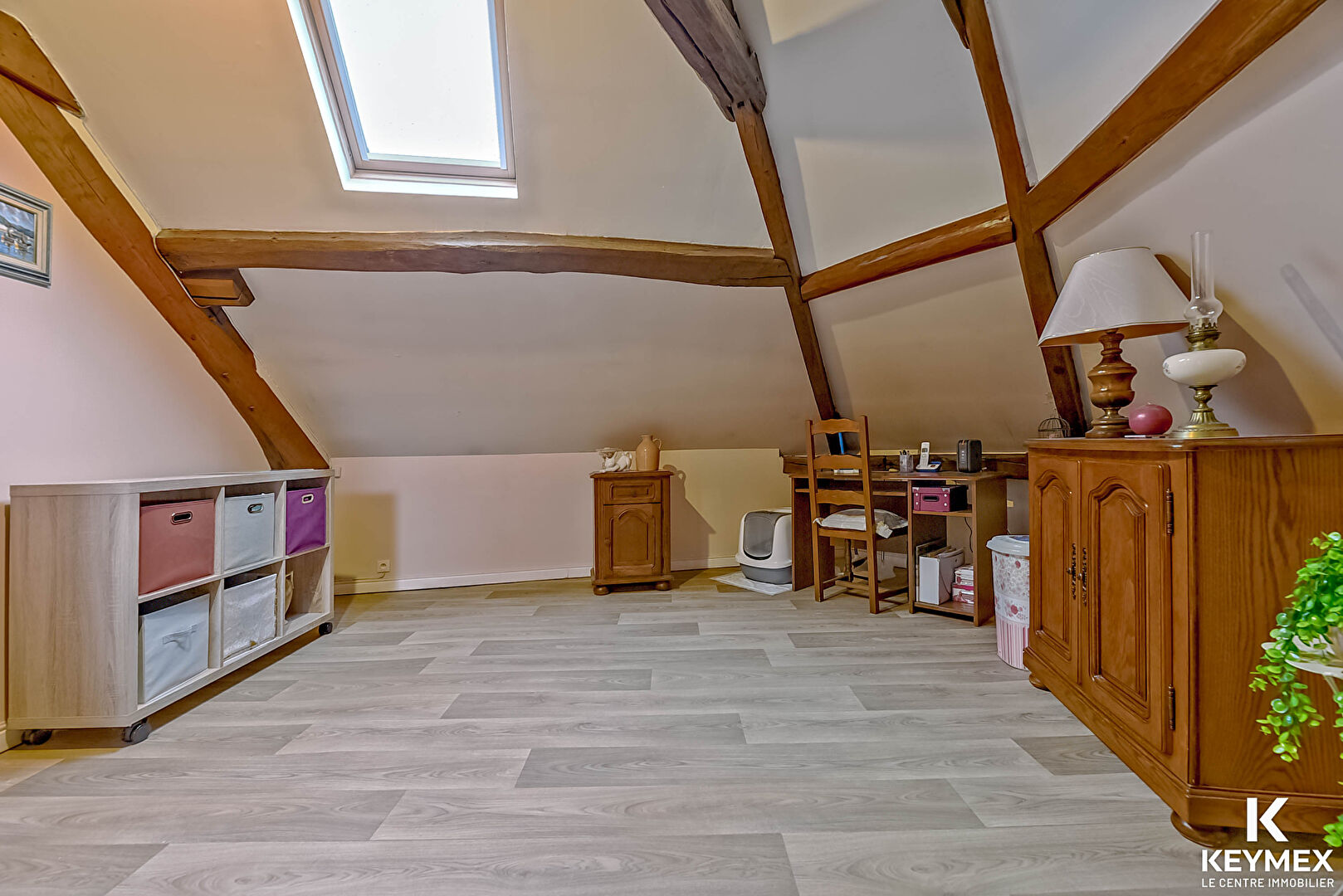 A l'étage, une pièce palière, pouvant servir de bureau, avec une magnifique charpente apparente vous donne accès à une chambre de plus de 30m² au sol et une salle de bains avec douche.
